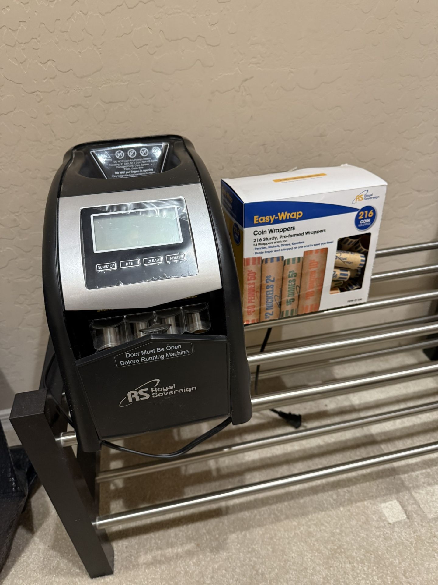 Royal Sovereign coin counting machine. Automatically sorts quarters, dimes, nickels and pennies. Automatically stops when a tube is complete. Includes the machine and assorted tubes. Located in Anthem Country Club. Local pick up only. Cash only.