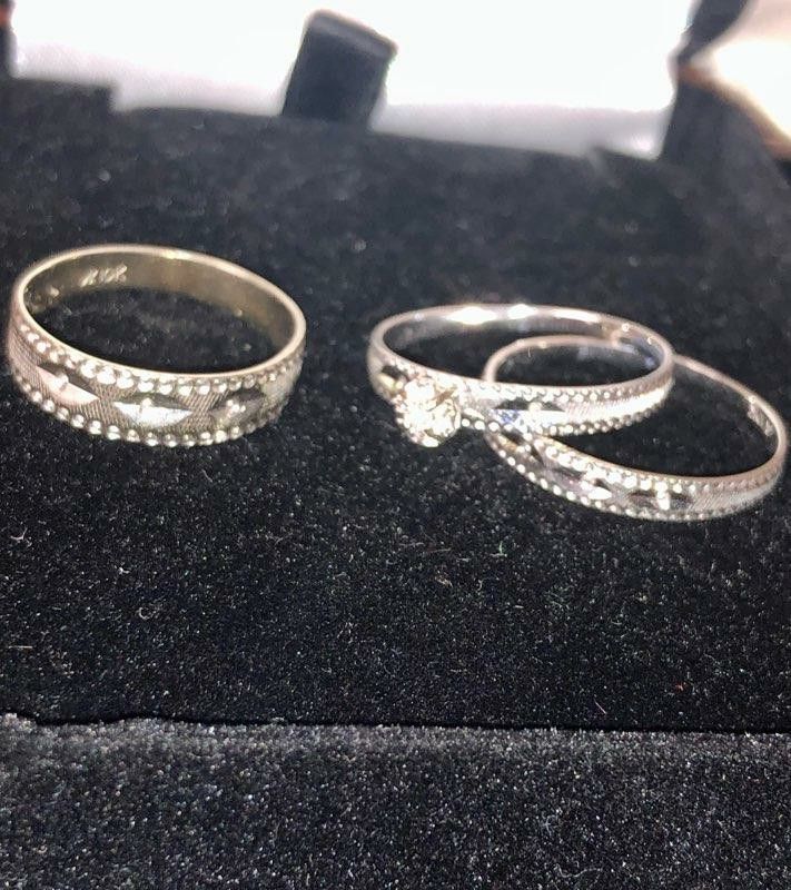 Set of wedding rings hers is size 7 his size 10 can always get resized. These are 10k white gold with 1/8 k i believe.