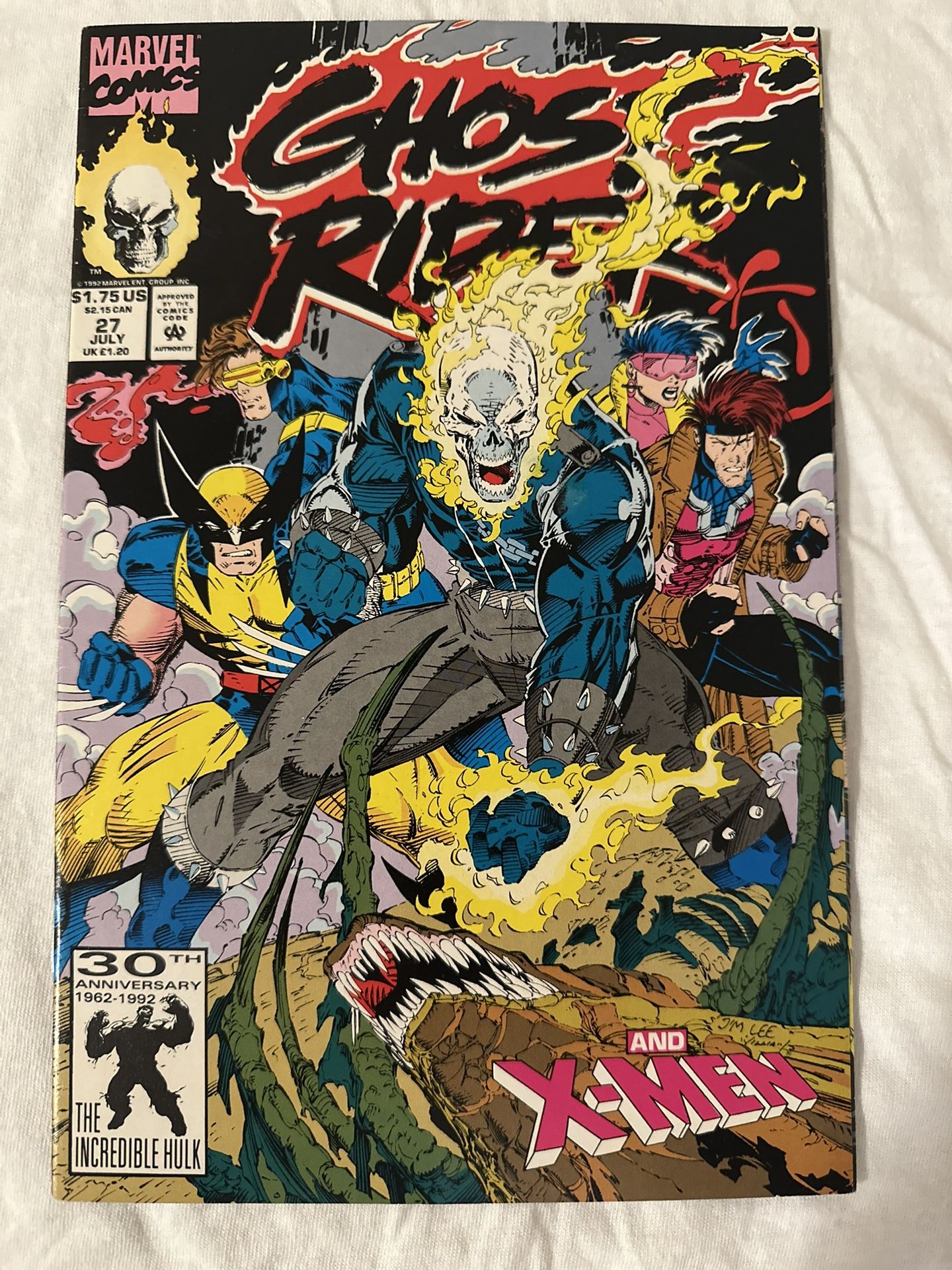 Condition is based on The Overstreet Guide to Grading Comics. That’s Ghost Rider and X-Men issue #27 from July 1992— Cover art by Jim Lee. A crossover comic published by Marvel during a time when supernatural and mutant themes were surging in popularity. Here’s a breakdown of what you’re looking at: 🧨 Cover Highlights The back cover has a light quarter sized stain in the upper right hand side above the shoe. • Ghost Rider takes center stage with his flaming skull and chains—classic 90s supernatural antihero energy. • Wolverine, Jubilee, and Beast from the X-Men are featured prominently, suggesting a team-up against a monstrous threat. • The creature attacking from the right adds horror flair, typical of Ghost Rider’s rogues gallery. • Price: $1.75 US • Date: July 1992 • Special Logo: Bottom right corner commemorates the 30th anniversary of The Incredible Hulk (1962–1992). 🔥 Why It Matters • This issue is part of the “Rise of the Midnight Sons” era, where Marvel leaned into darker, supernatural storytelling. • Crossovers like this were a big draw for fans of both horror and mutant action—especially collectors chasing team-up issues. • The 1992 date places it in the heart of the speculator boom, so condition and print run can affect its value.