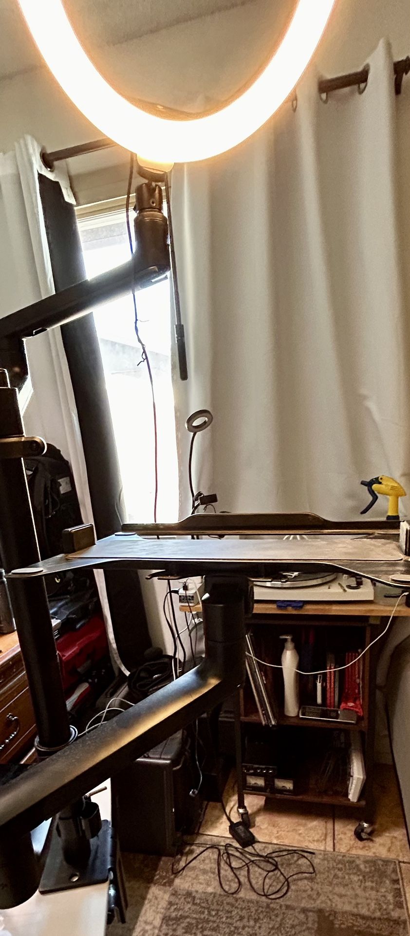 Dual armed computer stand/vlogging light. Dual articulating arms with single pipe with clamp for tabletops. Rarely used so basically new.