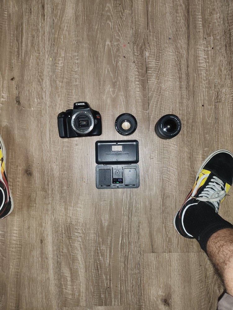 Canon T3, 18-55MM, 50MM EF 1.8 (old school plastic one), Battery Charging Case With 2 Extra Batteries