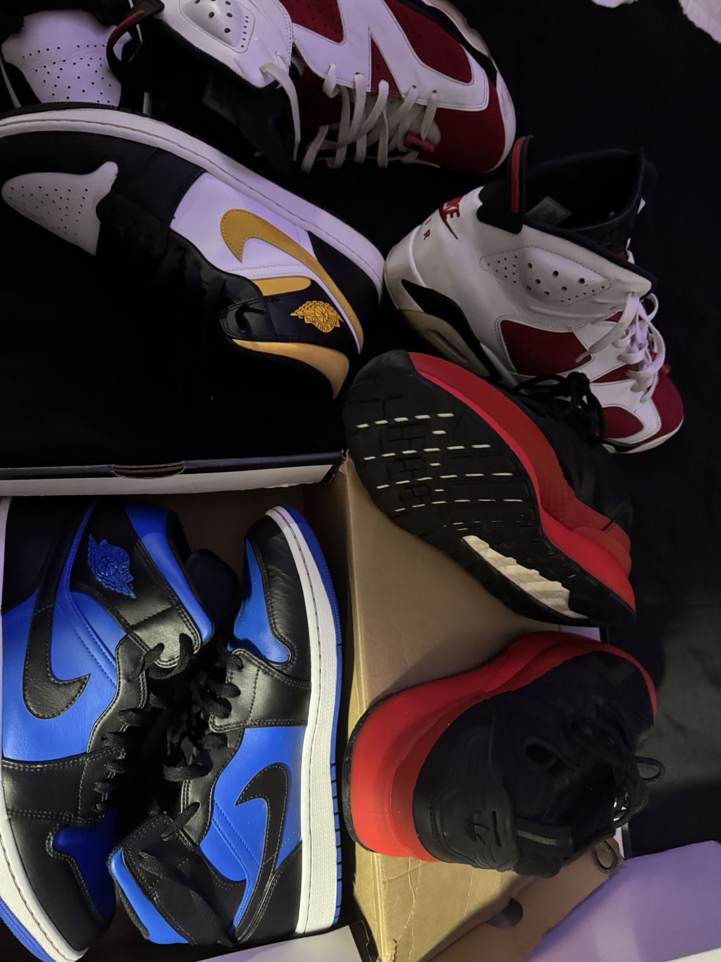 Size 11-12 got left is jordan 6 carmines (good condition) 2 Jordan 1 mids (great condition worn once both of them), Adidas Ultra Boost (new) size all red air force (worn 3 times) i can do 220 for all 5 pairs of shoes