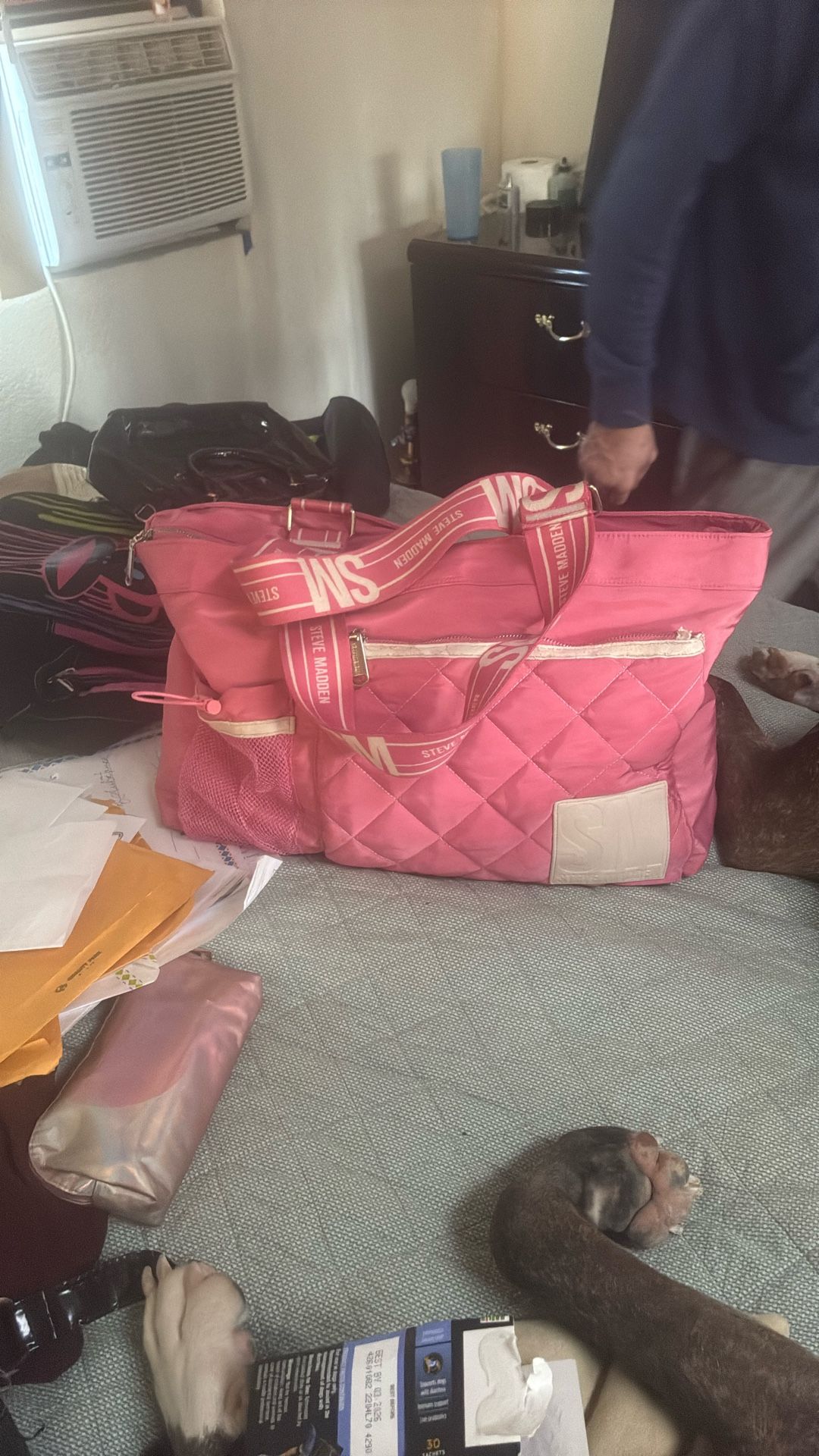 Like new Steve Madden bag pink slightly used. I paid 70 dollars for it. No rips no tears no broken zippers no stains big roomy nice bag