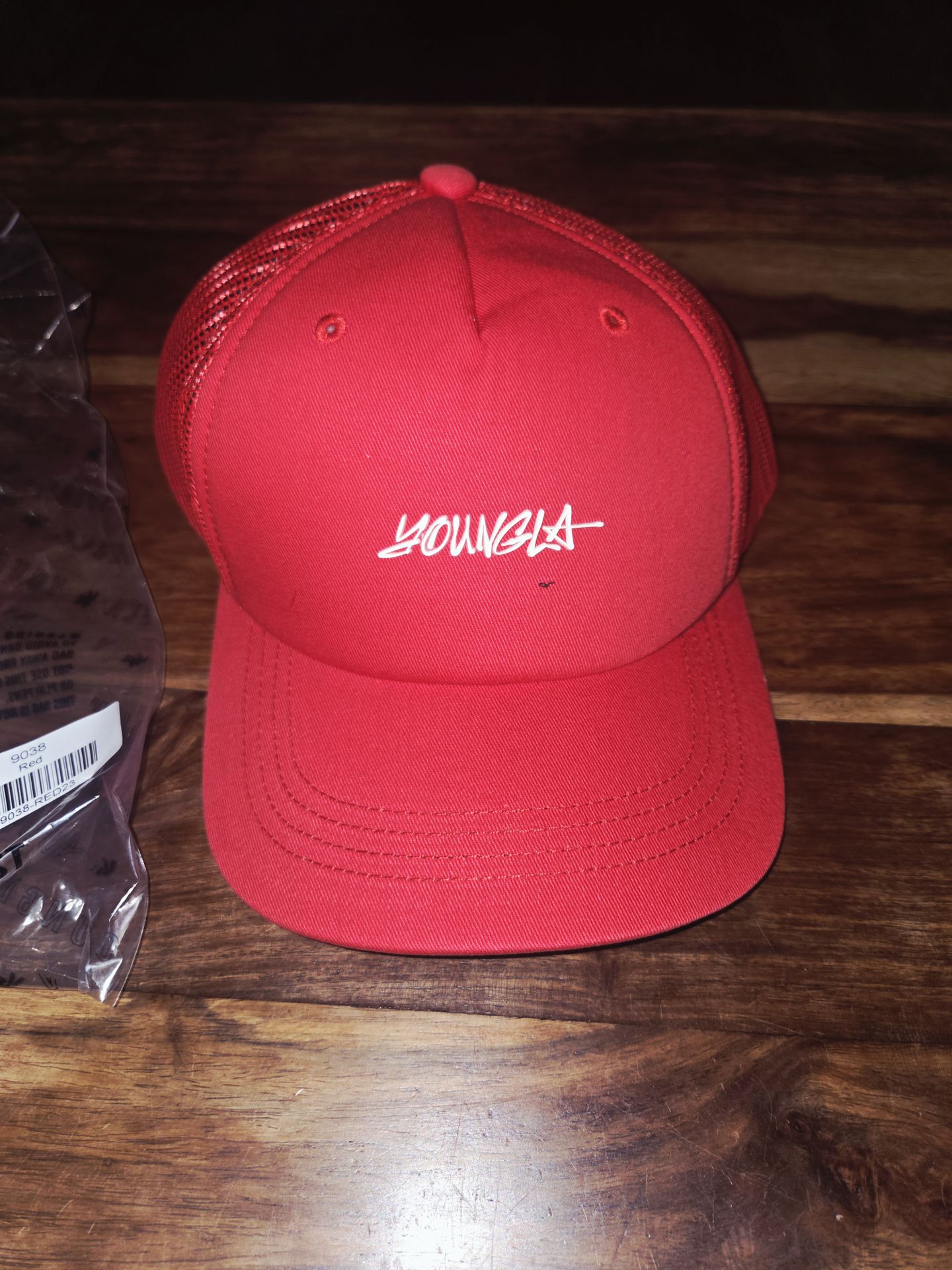 Bright red strap back trucker hat with YOUNGLA logo in white on front. Classic curved bill and breathable mesh back. Stylish, bold look that pairs with casual outfits.