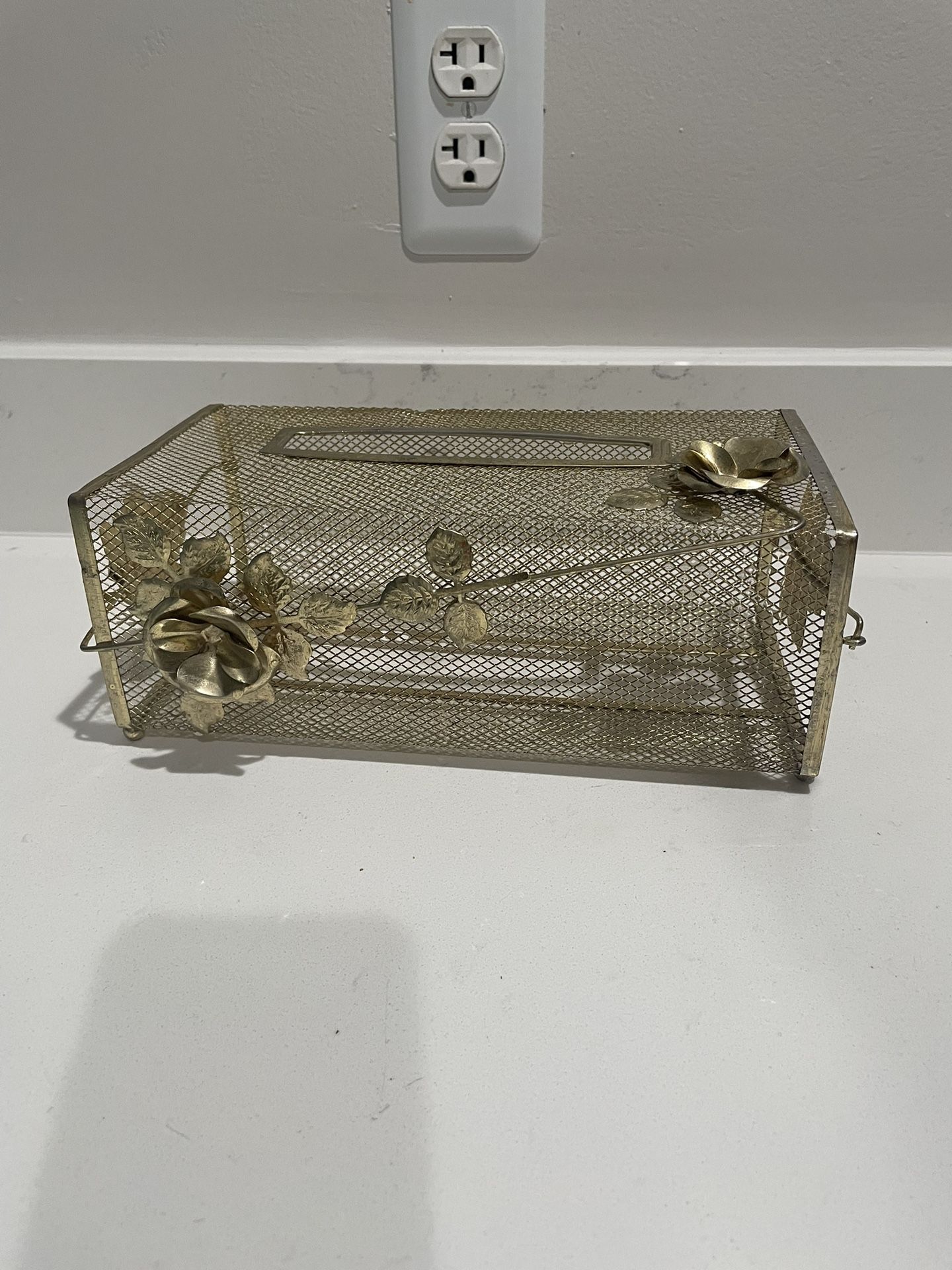 Vintage Metal Tissue Holder , Gold Metal Mesh Kleenex Box Cover With Metal Leaves and Flowers