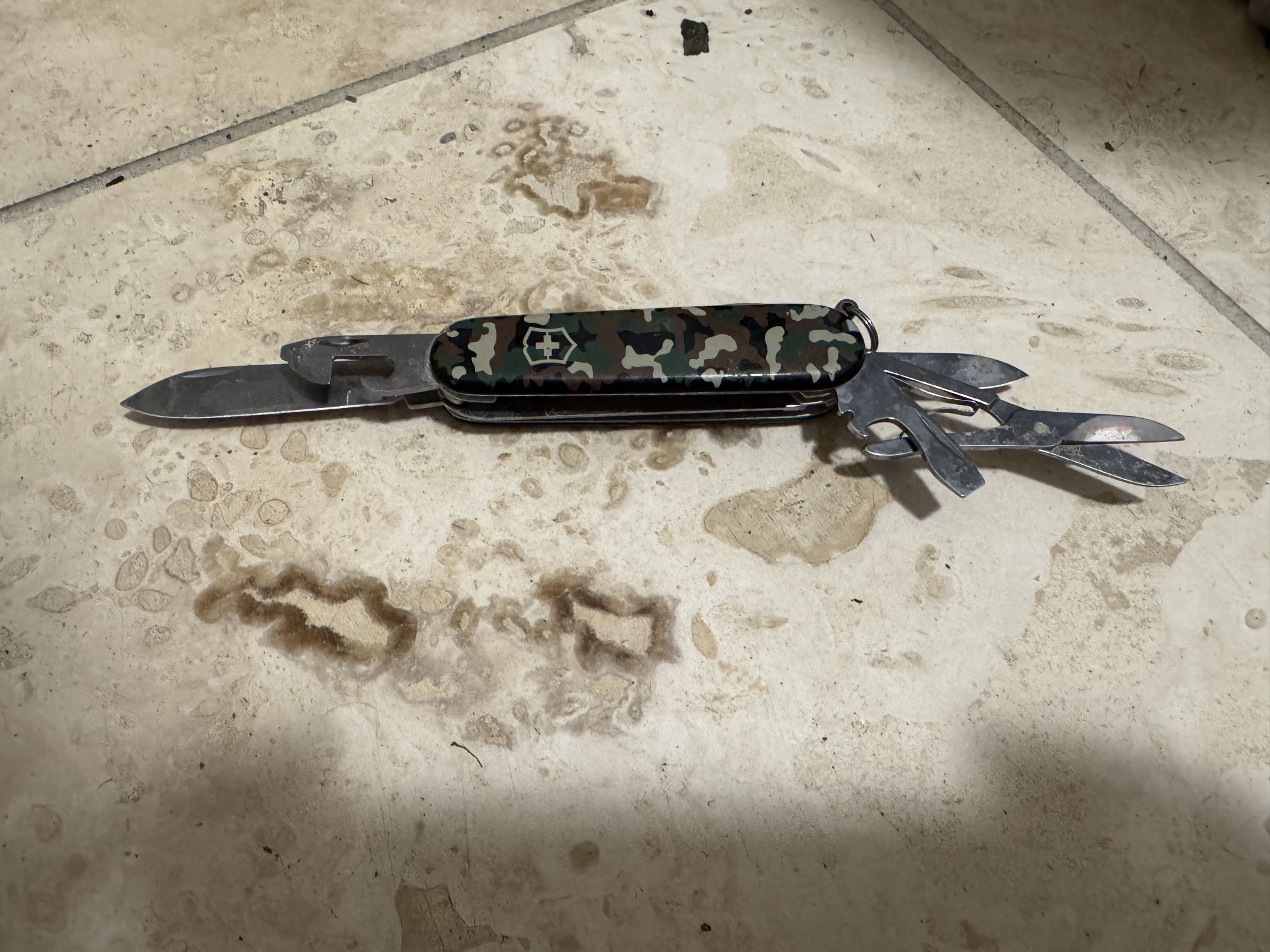 Authentic Victorinox Swiss Army Knife with camo handle design. Includes: • Knife blade • Scissors • Can opener • Bottle opener • Corkscrew • Screwdrivers and other small tools Condition: Used, with visible wear (see photos), but all tools open and close properly. Great for camping, hiking, or everyday use.