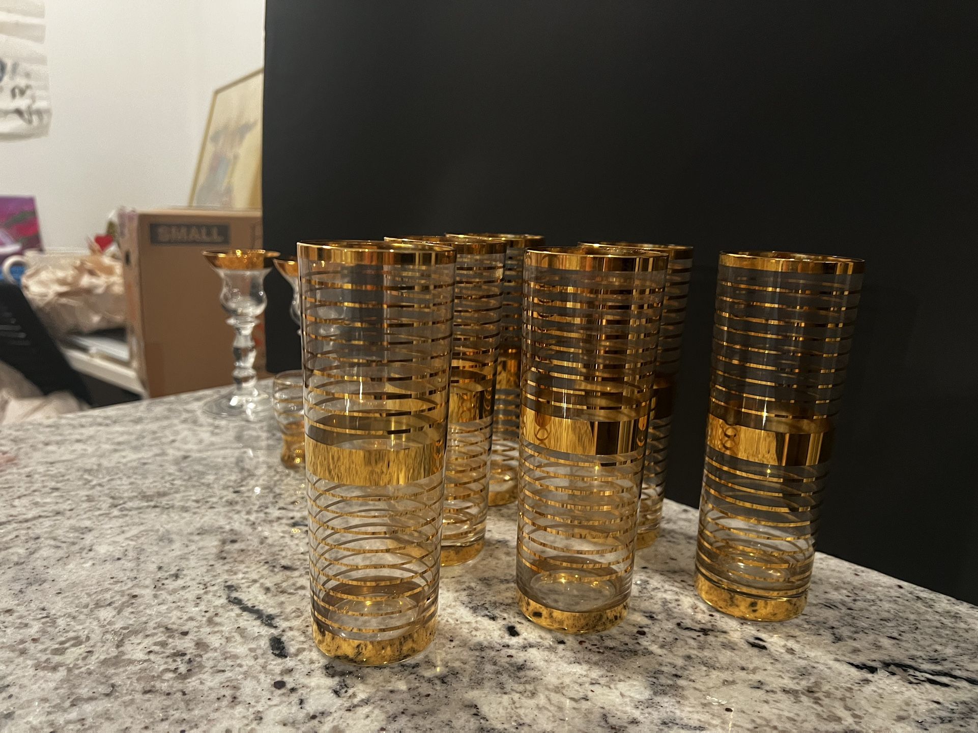 Turkish crystal with gold stripe drinking glasses six, shot glasses four, gold rim crystal candle holders two #82