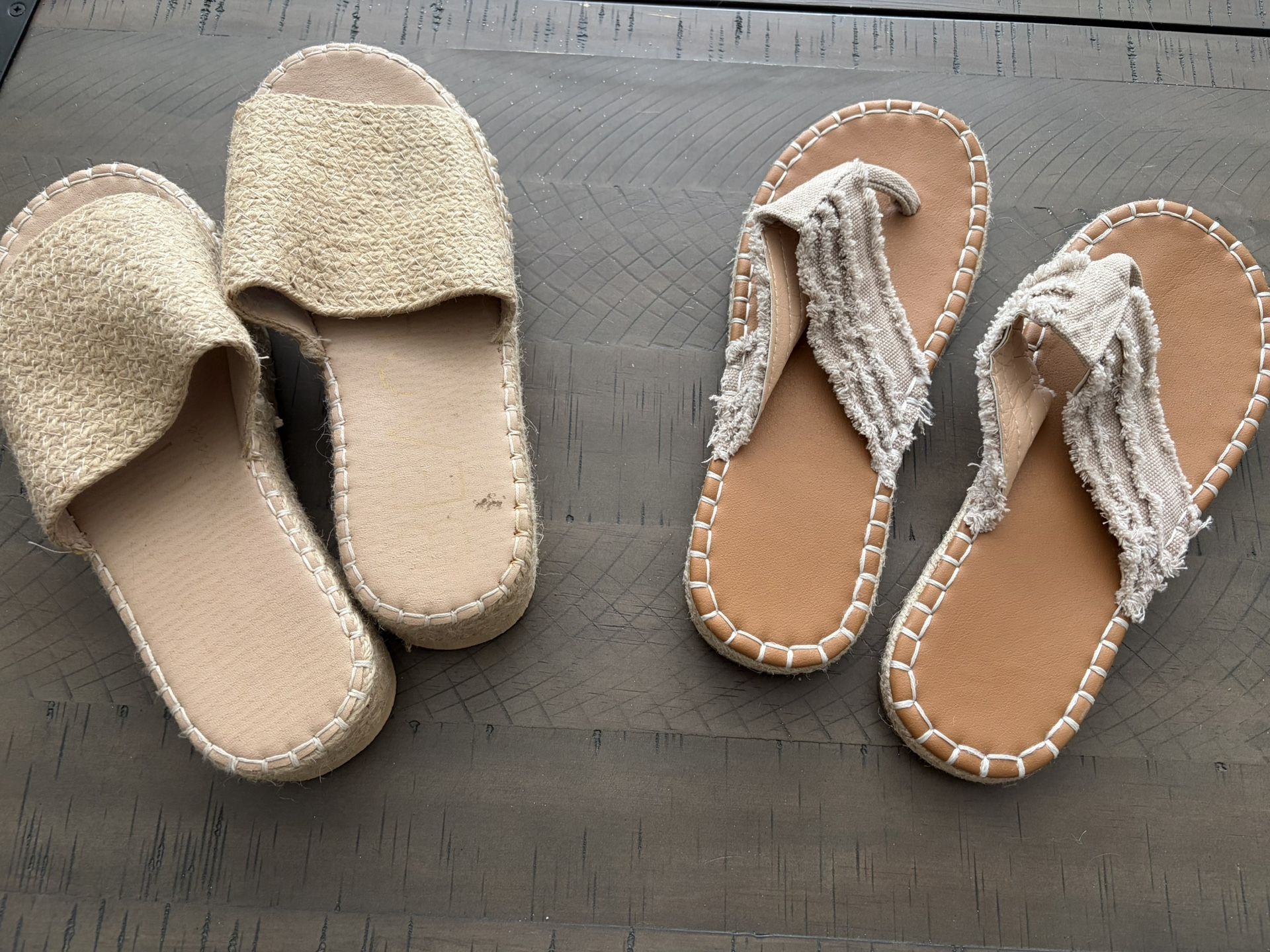 2 pair, super cute for summer, like new. One flat flip flop style. Other is a wedge style slide on. Both size 7. $10 takes both pair!!
