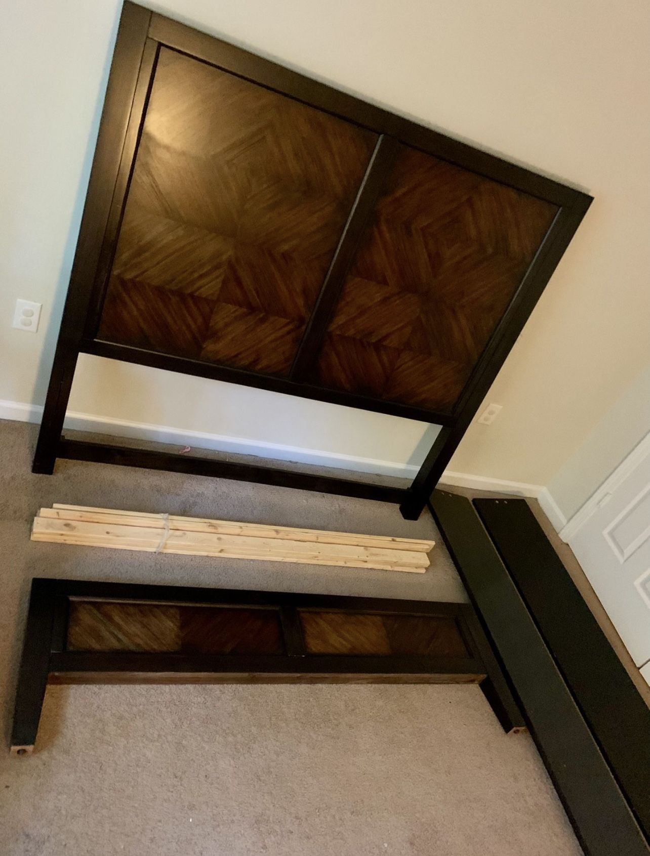 Very unique bed frame look. Pictures speak for themselves - check them out. Measurements: Headboard Length: 5 ft 5 inches Width: 3 inches Height: 4 ft 10 inches Footboard Length: 5 ft 5 inches Width: 3 inches Height: 16 inches Side Length: 6 ft 10 inches