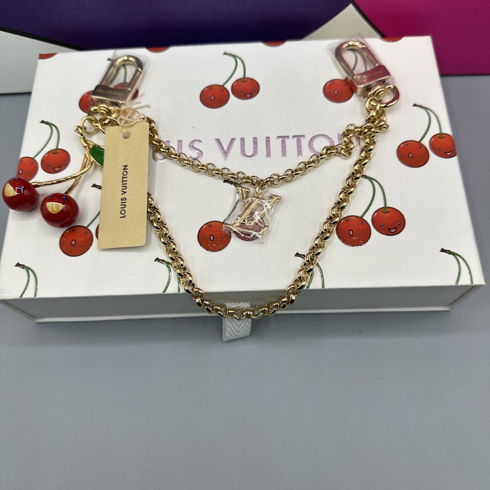Brand new LV x TM cherry bag charm Joining the re-edition of the Louis Vuitton x Murakami collection, the LV x TM LV Cerise bag chain adds a summery, on-trend accent to any handbag. Its double gold-toned chain is adorned with an LV Initials emblem and a pair of bright, cheerful cherries, a symbolic icon in the acclaimed Japanese artist’s work. This fun, stylish charm makes a perfect complement to the other creations in the collection