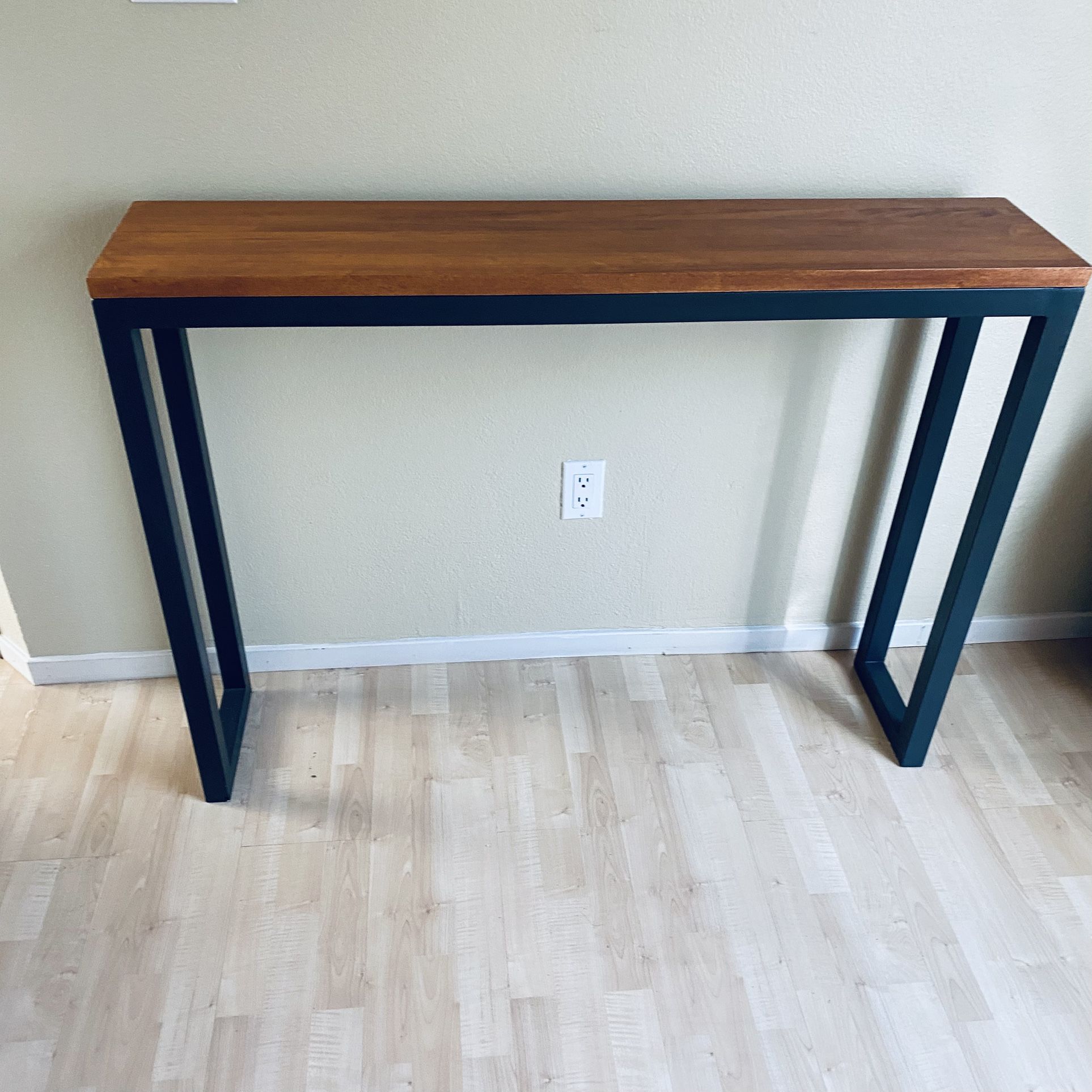 Wood and metal console top Length: 46 Height: 34” Width: 10 7/8” Wood thickness: 1” Metal leg thickness: 1 1/2”