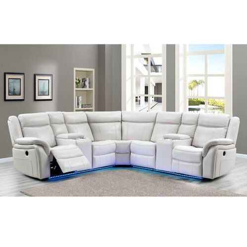 PRODUCT FEATURES Model: UM02PLAF-WHT-2 SKU: TAMPASEC2-WHT Attached back Button to turn on lights will be on end recliners Seat back to top: 29" Sectional with blue led lighting underneath both loveseats Seat dims: 21x21 | Wedge dims: 38 x 12(23) 2 recliners total (both LAF & RAF seats) Cup holders Theater lighting