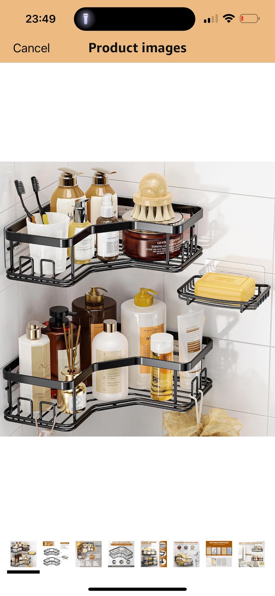 Corner Shower Caddy: 3 pack space-saving shower caddy makes the most of 90° corner space. It holds large shampoo bottles without taking up too much space. Features 8 hooks for brushes, loofahs, towels, razors, plus a soap holder for soap or small items, definitely helps with organization in the shower Sturdy Design for 40 LBS: Our clear adhesive uses advanced tech to hold up to 40 lbs without slipping. Residue-free - leaves no marks or sticky goo on walls. Perfect for family, renters or anyone redoing space! Easily remove it cleanly, just heat it with hair dryer to peel off intact Easy Installation: No drilling tools needed! The shower organizer uses strong adhesive for true tool-free setup that won't damage wall. Just peel, stick firmly to dry, smooth walls, hang the shower shelves for inside shower, and let cure for 24 hours, plus 2 spare shelf adhesives included for repositioning or replacements Premium Stainless Steel: Built with quality stainless steel that's waterproof, rustproof, and easy to use in humid bathroom. Just a quick, easy wipe-down keeps shower storage rack clean. The hollow design prevents water buildup, makes our bath look cleaner and organized Versatile Application: Forget space limits! Perfect for humid bathroom, bathtubs, RV sink areas, kitchen cleaning tools, laundry room and more. Just stick adhesive to tiles, tempered glass, fiberglass, wood, or any smooth surface(not for wallpaper, painted, lime, rough, concrete walls or textured surfaces—always check wall compatibility first)