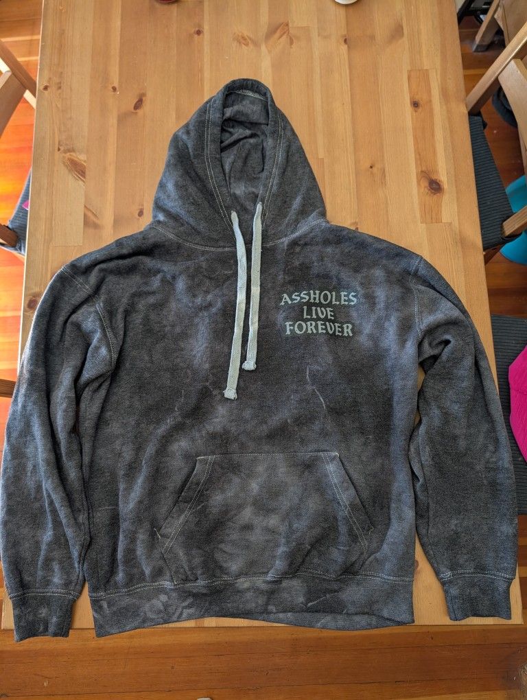 Assholes Live Forever hoodie, heavy jersey material, very warm and cozy. Drawstring hood, grey, printed on front and back. Excellent condition, minimal wear.