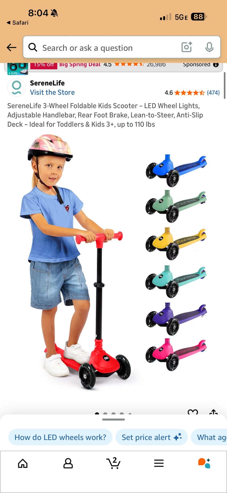 The SereneLife 3-Wheel Foldable Kids Scooter in red is a fun and stylish choice for young riders. This kick scooter is equipped with built-in LED wheel lights, adding a cool and vibrant touch to the overall design. With its sturdy 3-wheel construction, this scooter is suitable for off-road use, providing a stable and smooth ride for kids. The SereneLife brand ensures quality and durability, making this model a reliable choice for outdoor sports and recreational activities.