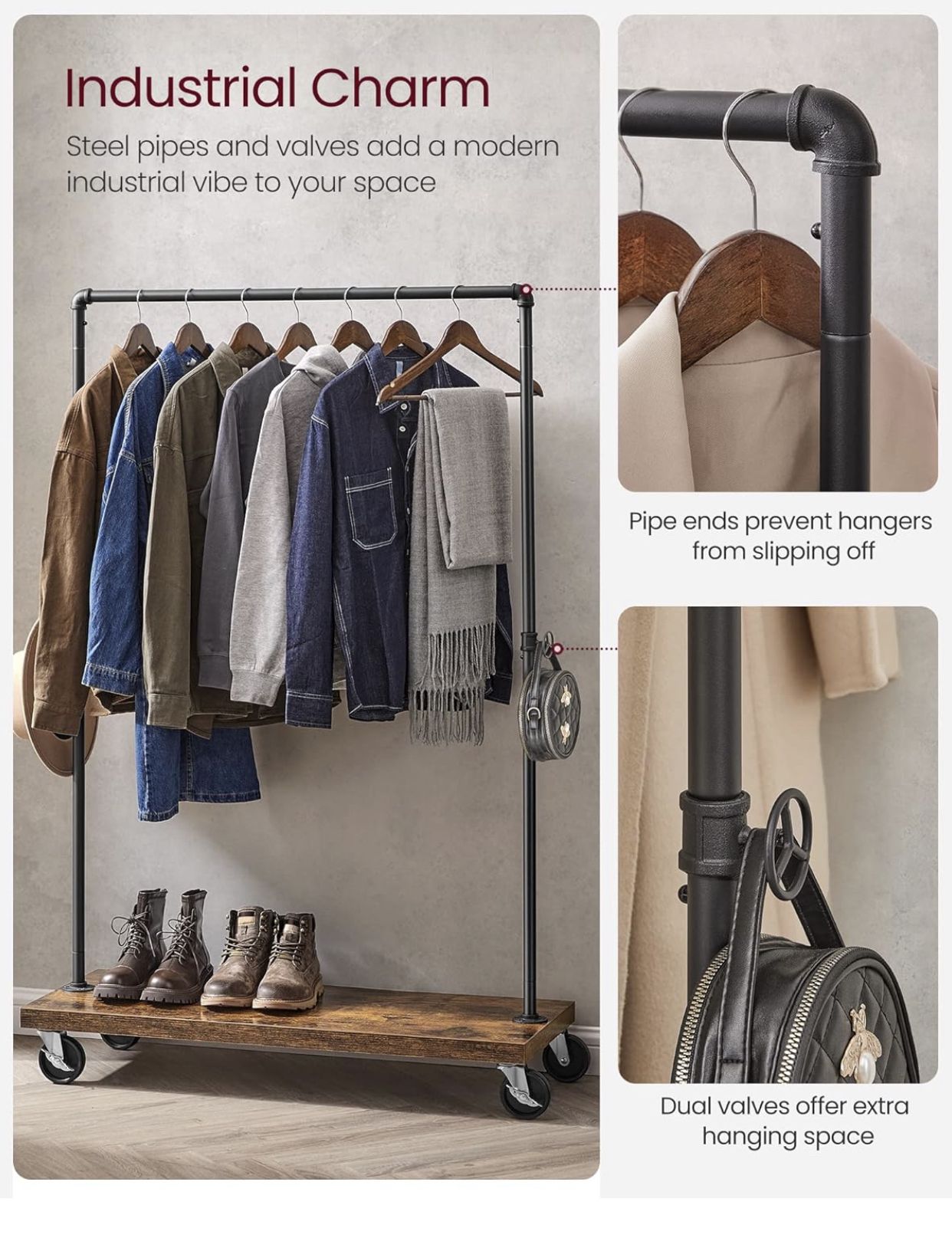 Clothes Rack, Heavy Duty Clothing Rack, Industrial Pipe Style Rolling Garment Rack with Shelf, for Bedroom, Laundry Room, Retail Store, Rustic Brown and Black UHSR65BX
