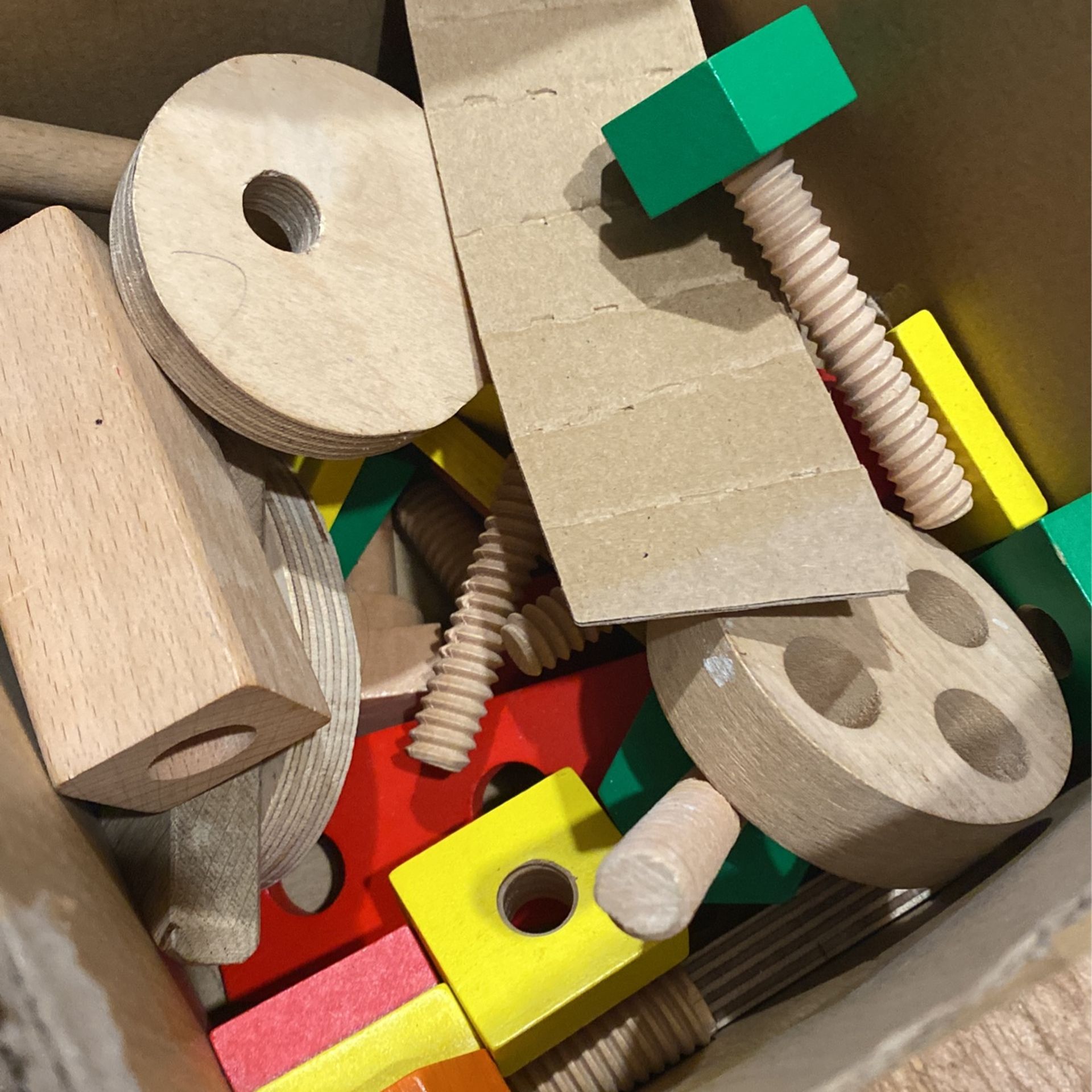 Wood toy building bolts and tools Random things to spark a builders imagination Parts from various sets of+ several handmade Truly custom / authentic “Montessori “ ;) $10 for the lot Cash preferred, all sales of kids dots go to our child. He sets the terms. Thanks for looking!