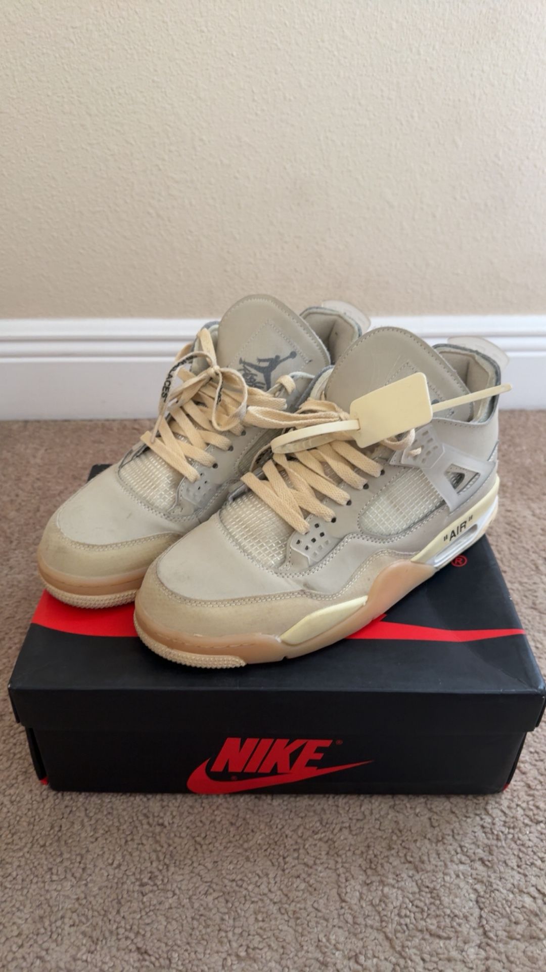 Selling a pair of Off-White x Jordan 4 “Sail” in size 11. Used condition. Worn a few times. Still solid and wearable but they got some creases, dirt, and yellowing on the soles from age. Comes with the original box (a little beat up), zip tie, and everything in the pics. Size: • US 11 • UK 10 • EUR 45 Check pics for condition. What you see is what you get. No returns. Message me if you got questions.