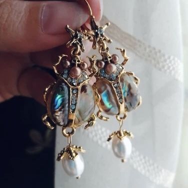 Mission Viejo❗️Meet Ups @ La Paz & Marguerite Pkwy Can also ship via USPS with tracking # 📬 (add $) ~~~~~~~~~~~~~~~~~~~~~~~~~ vintage style beetle earrings made of zinc alloy, glass pearls, crystals, and resin “vintage inspired” 3” from top to bottom