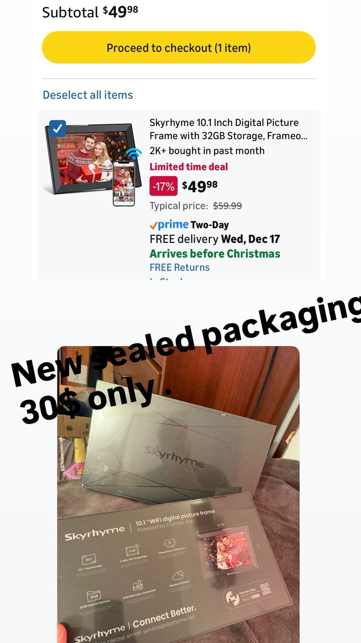 10.1 Inch Digital Picture Frame with 32GB Storage, Frameo WiFi Digital Photo Frame, 1280 * 800 IPS Touch Screen, Auto-Rotate Slideshow, Easy to Share Photo/Video via Free App New sealed packaging Pick up Belmont and broadway Chicago 2 days shipping for 7$ Price is very . Any lower offers will be ignored