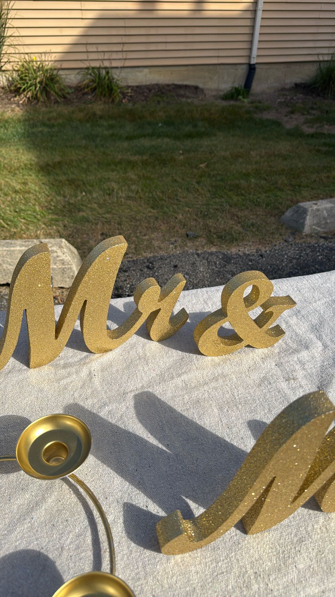 Beautiful giant Mr &Mrs can be spray painted to whatever color you need Candle holders and other table decor all in great shape!