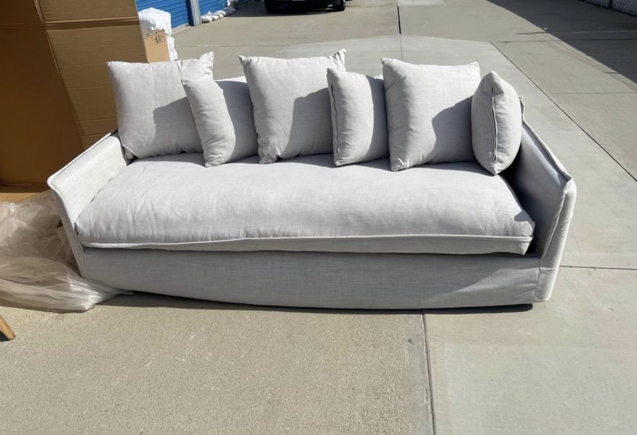 Plush deep seating. Subtle linen upholstery Light grey to white-grey Black round concealed feet One large base pillow, 3 larger floating back cushions, 3 smaller cushions. 6 total. Brand new in box. Only took out for pictures Currently have 2 available. $545 each.