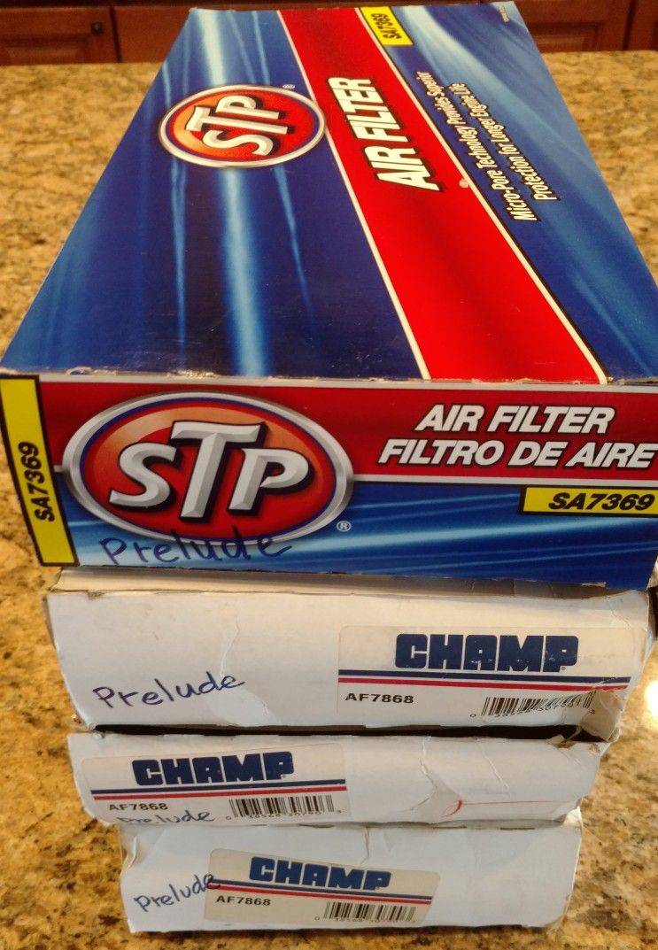 (4) Engine Air Filters – Honda Prelude (1992–2001) ================================================= $15 each – or $50 for all 4 ✔ (3) CHAMP AF7868 ✔ (1) STP SA7369 ✔ Fits Honda Prelude models: -- 1992–2001 L4 2.2L -- 1992–1996 L4 2.3L ✔ Amazon sells for $24+ each ====================== Equivalent Filter Part Numbers: ====================== AC-DELCO A1296C, Ashika (contact info removed), Beck/Arnley 042-1526, Bosch 73285, CarCare AF7369, CarQuest 88110, Cenex CA7868, Denso 143-3163, Grand Prix AF7868, Group 7 A24730, Hastings AF138, Hoffer 16040, Honda 17220-P13-000, IAPCO AF319, Japanparts FA427S, Japko 20427, Jiffy Lube HA7369, Jiffy Lube JLA4730, K&N 33-2090, Knecht LX840, Luberfiner AF7868, Magneti Marelli (contact info removed)0, Mahle LX840, Mann C3327, Meat-Doria 16040, Mighty A24730, Mobil A24730, NAPA 6110, OE+ AF-7235, Pennzoil PZA-229, Performax PA-229, Promotive AF4730, Purolator A24730, Security AF7868, Service 1 AF4730, Shell A24730, Sofima S3237A 👉 Check out my other listings too — the more items you bundle, the better deal I can make! Keywords: Honda Prelude air filter, CHAMP AF7868, STP SA7369, Honda air filter 1992, 1993, 1994, 1995, 1996, 1997, 1998, 1999, 2000, 2001, replacement air filter, performance air filter, engine filter, auto parts