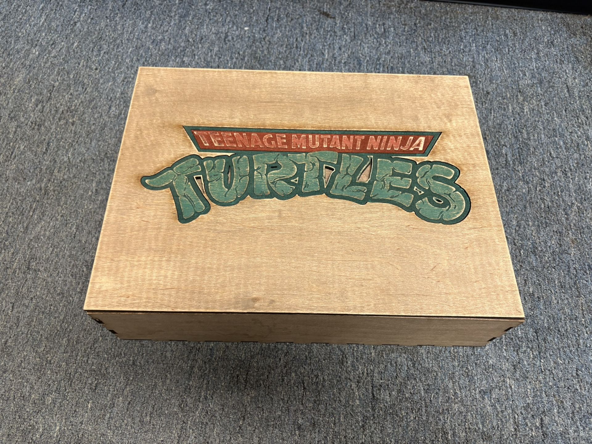 Wooden box with decanter and 6 glasses, plus 6 wood coasters. All items have Teenage mutant ninja turtle characters engraved on them. Was engraved with a name, now sanded off under the top lid. Rest of the items never touched, still in new condition. Cash only, no delivery option.