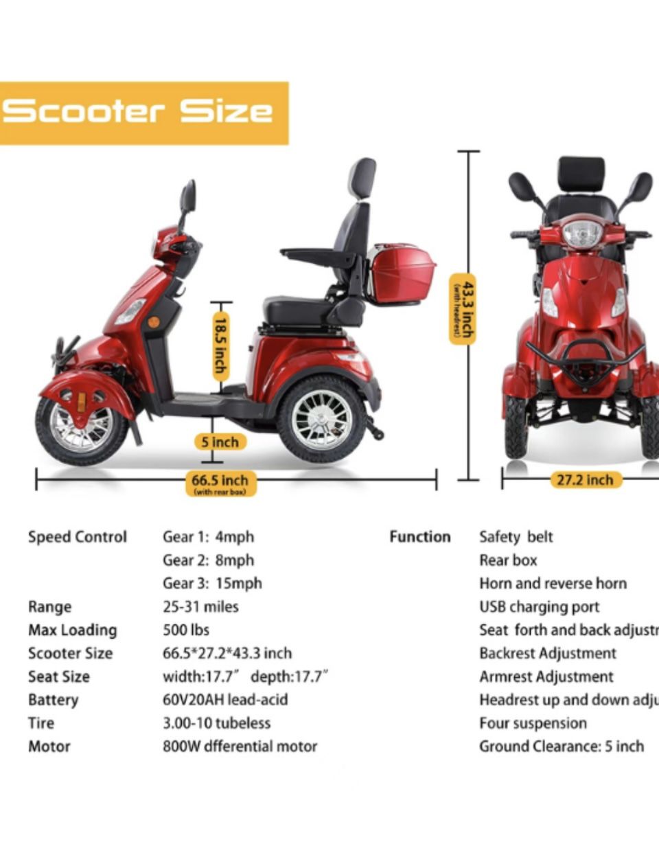 60 volt DC, Three speeds, turn signals, stop lights, mirrors, adjustable seat, parking brakes, brand new batteries,(5), charger, nylon cover, horn. Approx 30 mile range.
