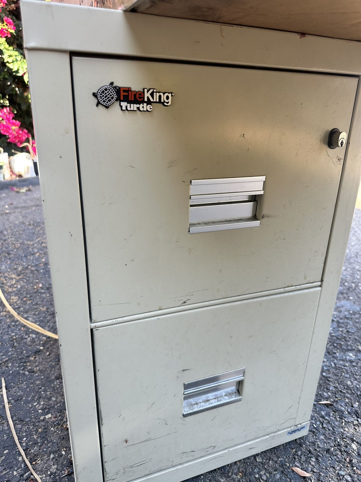 Minor imperfections due to age. Description The Turtle file cabinet is perfect for the home, personal office or small business offering tough protection and flexible filing accommodating both legal and letter sized documents. It has a UL 1-Hour Class 350 Fire Rating and undergoes exhaustive testing procedures passing both fire and explosion hazard tests conducted by Underwriters Laboratories, which expose the file to temperatures of 1700 degrees for one hour resulting in the internal temperature not exceeding 350 degrees. With the UL Impact Rating, it will survive a loaded fall of 30 feet and maintain fire protection. FireKing’s steel lattice reinforcement offers this impact protection on all six sides. Oven-dried Gypsum Insulation is asbestos-free, dry insulation that will maintain protection properties for a lifetime, and completely eliminate corrosion. An electrostatic powder coated finish is applied to all sides including the bottom. The finish is scratch-resistant, providing a lifetime quality appearance. The file features field-Replaceable Steel Panels. In the event that any panel is damaged, it can be easily replaced. Insulation between all drawers makes each drawer a separate insulated container. Drawers are built with high sides for use with hanging folders – no additional frames are required. A lock by pass features a two-position drawer catch, which allows access to certain drawers, while drawers containing sensitive information remain locked. It is equipped with a key lock to limit access to vital records. FireKing insulated files are backed by over 60 years of experience in design and building superior, quality fire resistant products. And after a FireKing file performs its job in a fire, we’ll replace the file free. Lifetime Limited Warranty. Made in the USA. Features & details Two letter/legal-size file drawers with high sides for use with hanging folders – no additional frames are needed. Equipped with a key lock to limit access to vital records Fireproof insulation is 100% gypsum reinforced by a 1” x 2” lattice made of 14-gauge galvanized welded steel wire, providing complete peace of mind from fire, impact, or explosion. 1-Hour Class 350 Fire with Impact UL label. Tests include 1 hour exterior file exposure at 1700°F, a 2000°F explosion test, and a 30 foot drop to test impact integrity. ETL Electronic Media Protection protects electronics for 30 minutes in a fire. 2-position drawer catch allows access to certain drawers while others remain locked. Made in USA Product Description Color: Parchment Weight: 255 lbs External Dimensions: 27-3/4" High x 17-3/4" Wide x 22-1/8" Deep Highlights Impact resistant Water-resistant—designed to prevent water damage resulting from sprinklers and fire hoses Lock keeps contents safe Accommodates letter or legal size hanging folders Internal Drawer Dimensions: 10-3/8" High x 12-3/16" Wide x 15-1/8" Deep Overall Depth with Drawer Extended: 41-1/8"