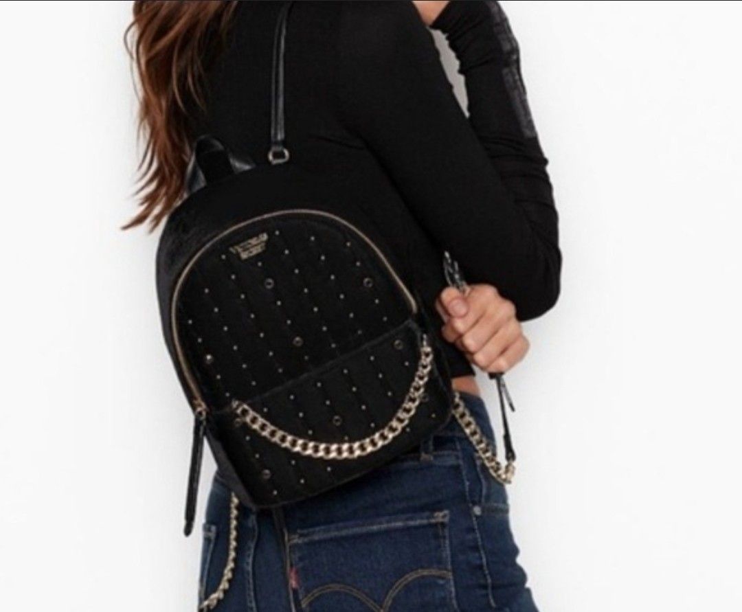 Selling this stylish and trendy mini backpack from Victoria’s Secret. It’s black with gold stud accents, a front zip pocket, and chain detailing that adds a bold, fashionable touch. The drawstring and magnetic flap closure keep your items secure, and the adjustable straps make it easy to wear. Only used a couple of times – still in great condition with no damage or stains. Perfect for casual outings, concerts, or everyday wear. Feel free to message me with any questions!