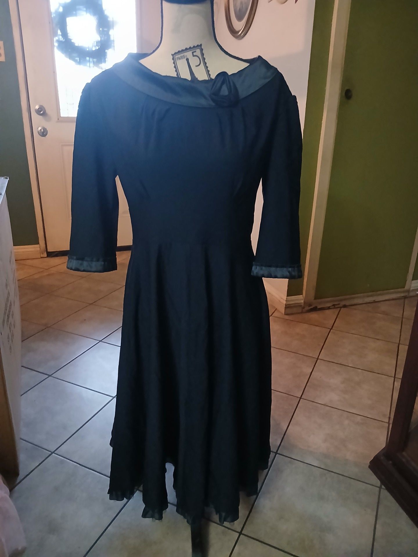 Stylish MUXXN dress, size 3XL. Dark blue color with a pretty satin collar and ruffled cuffs. Midi length with a flared skirt. Has a classic look.