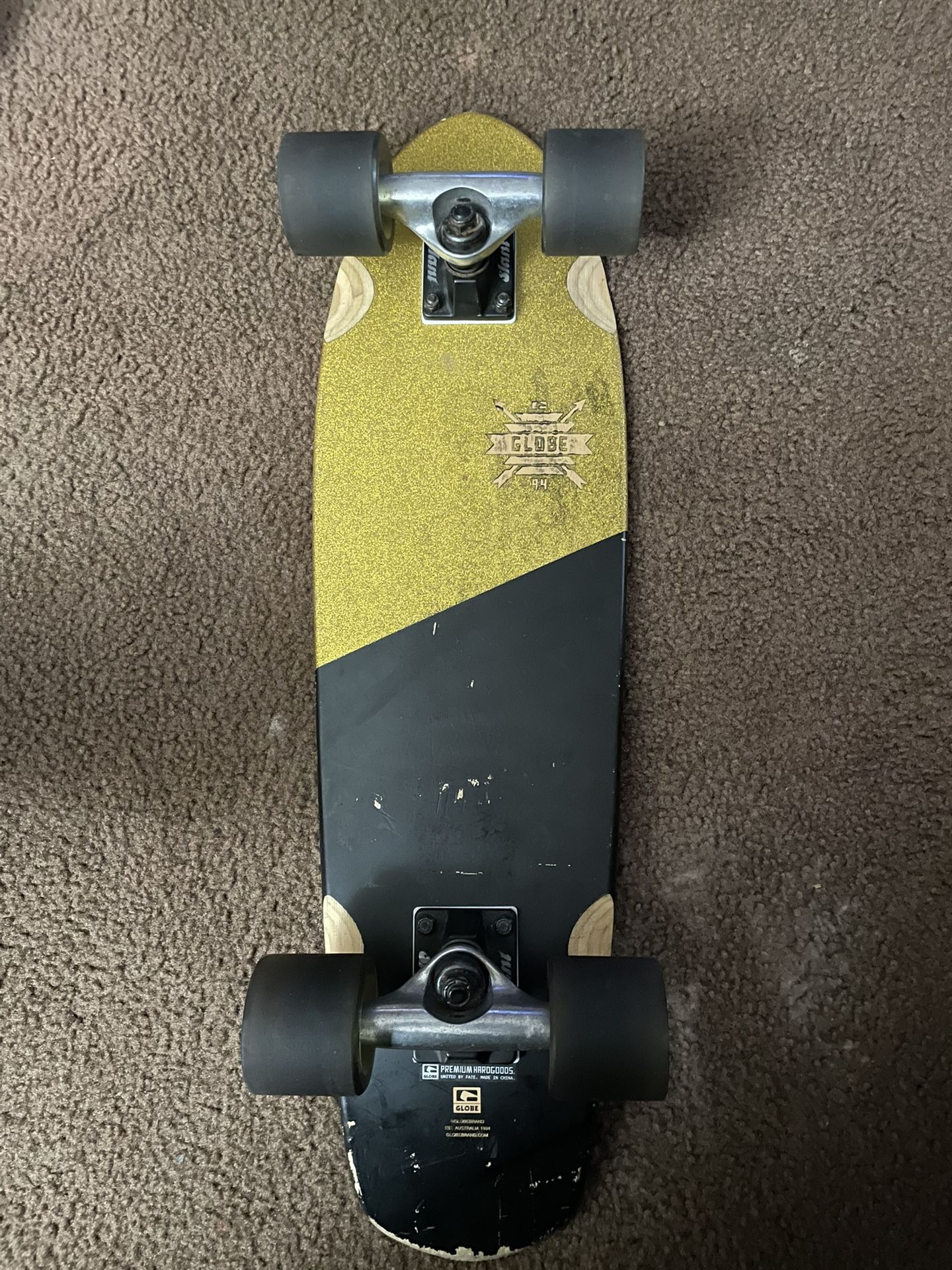 Black and gold globe cruiser board Globe wheels good condition Farely new Mob grip (probably just stepped on something and dirty) Slant trucks