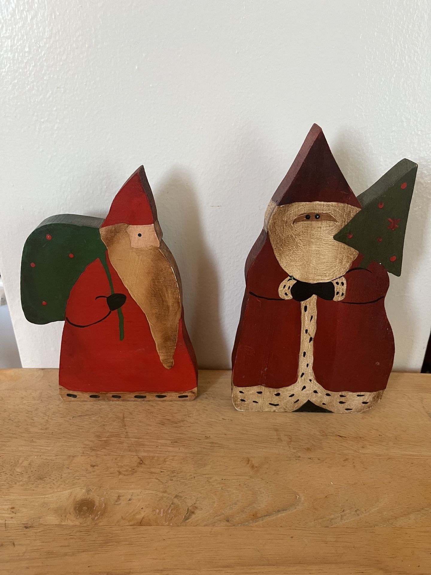 Vintage Christmas Hand Carved Painted Wood Folk Art Santa Set of 2 Signed in San Francisco