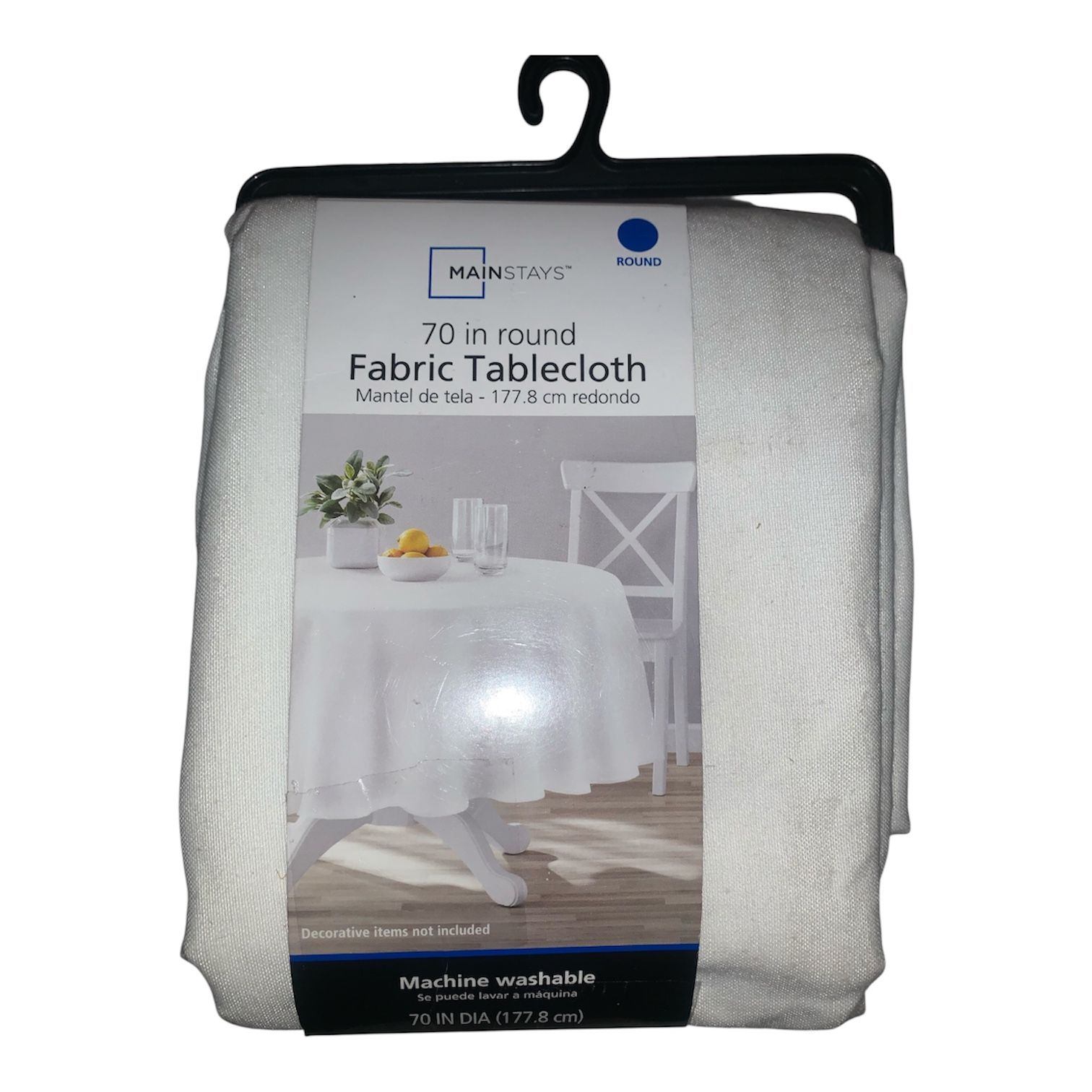 Brand New Mainstays Solid White 70” Round Table Cloth Durable 60% Cotton / 40% Polyester blend Fully machine washable Ideal for round tables between 30”-60” inch, gives an 11” in drop standard 48-inch table. Great for at Home or Wedding Tables