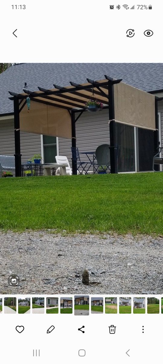 All metal Gazebo 10' by 10'. The top cover is like brand new. You must take it apart if you don't have a trailer to haul it on as is.