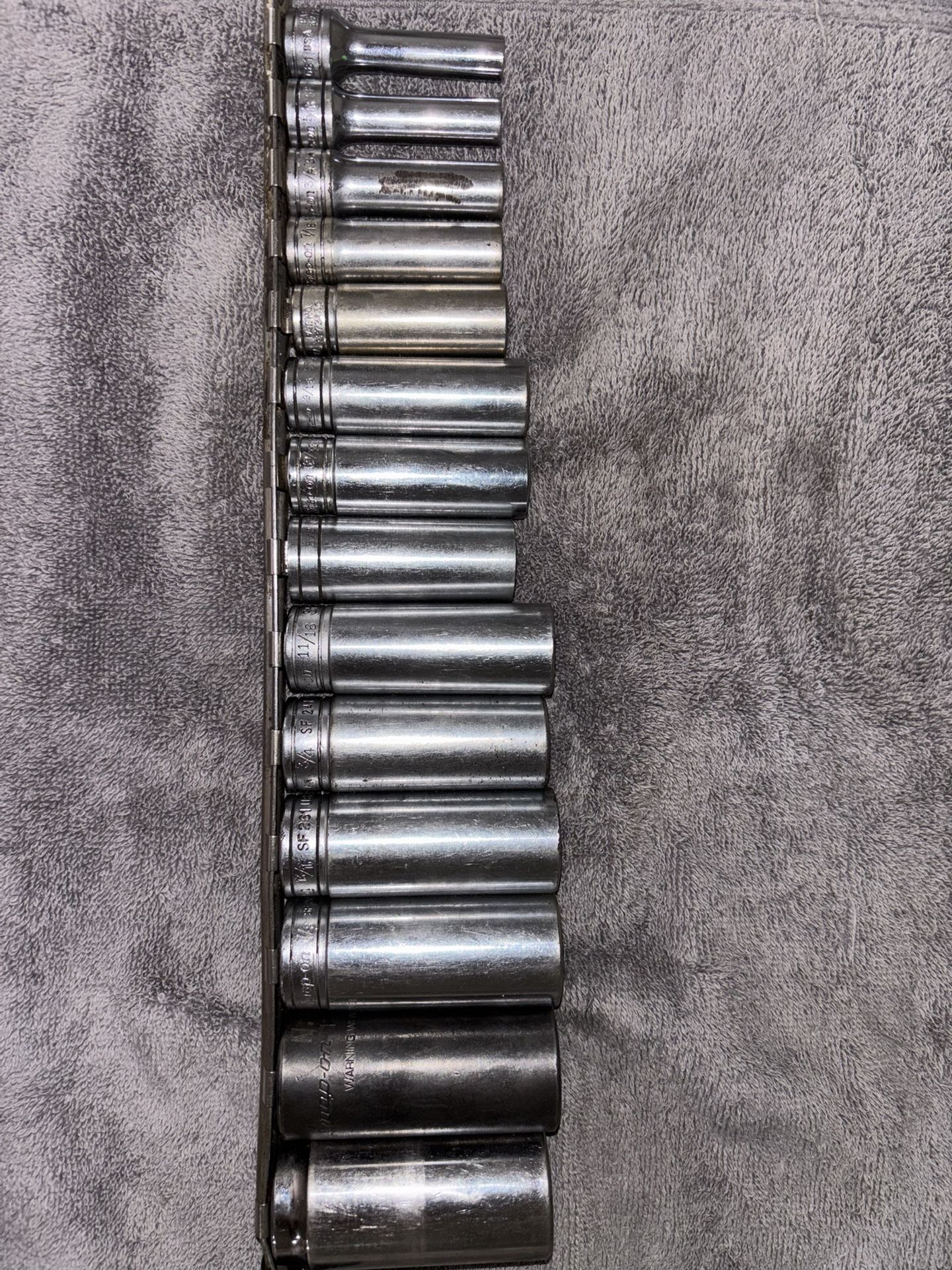I have a 14 piece Snap-On Deep Socket Set. Sizes are 1/4”, 5/16”, 3/8”, 7/16”, 1/2”, 9/16”, 19/32”, 5/8”, 11/16”, 3/4”, 13/16”, 7/8”, 15/16”, 1”. Asking $160 obo.