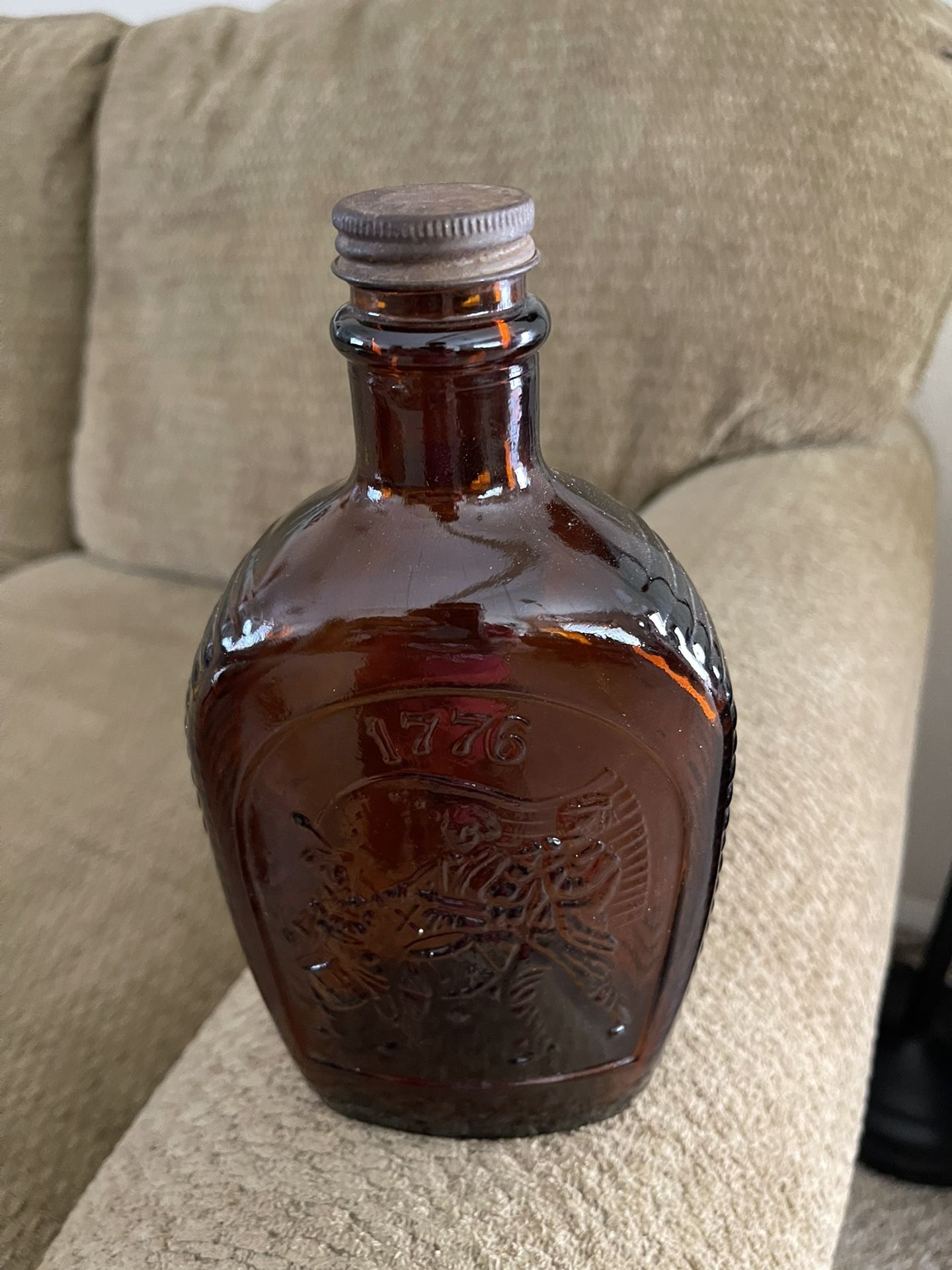 1976 Vintage Log Cabin Syrup Bottle Bicentennial Amber Glass 1776