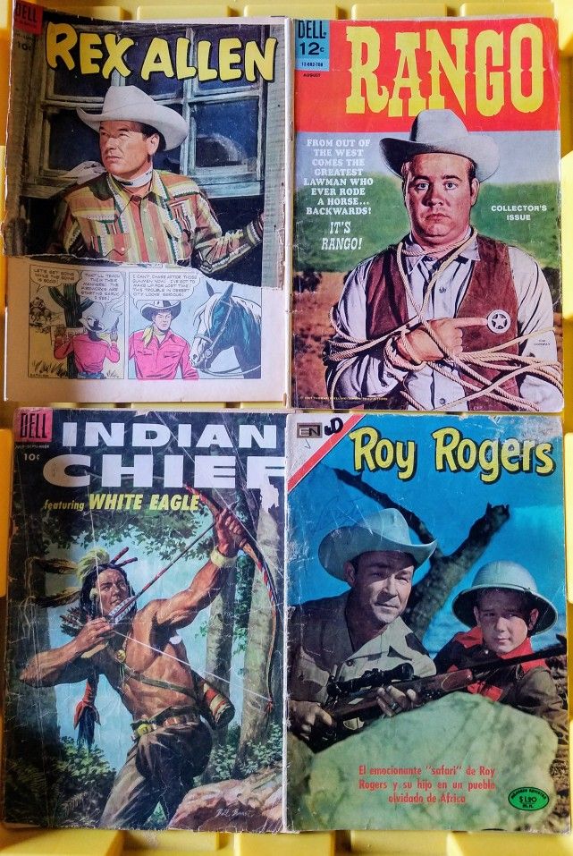 8 comic books, rough shape. Indian chief dell July Roy rogers in Spanish Rango dell august Rex allen dell june Bonanza black day @ virgina city Pow wow smith indian
