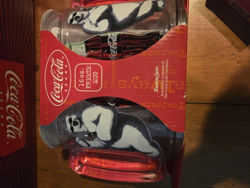 Pair of 16 oz Coca-Cola freeze mug set. Excellent condition still in the box. Cash only. Ask about my other Coca-Cola items