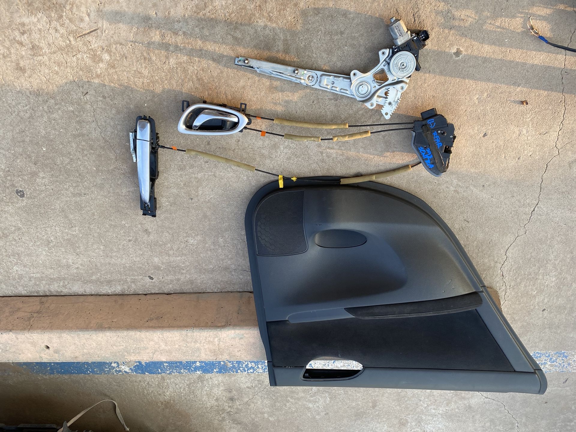 Ask for what you need for pricing 2013 Nissan Sentra left side door accessories: Rear: Door panel with window control Door handles (interior/exterior) with ropes Door latch Door window Window regulator Front driver door: Door panel with main control switch Mirror complete Door handles (interior/exterior)with ropes Door latch Door window Window regulator