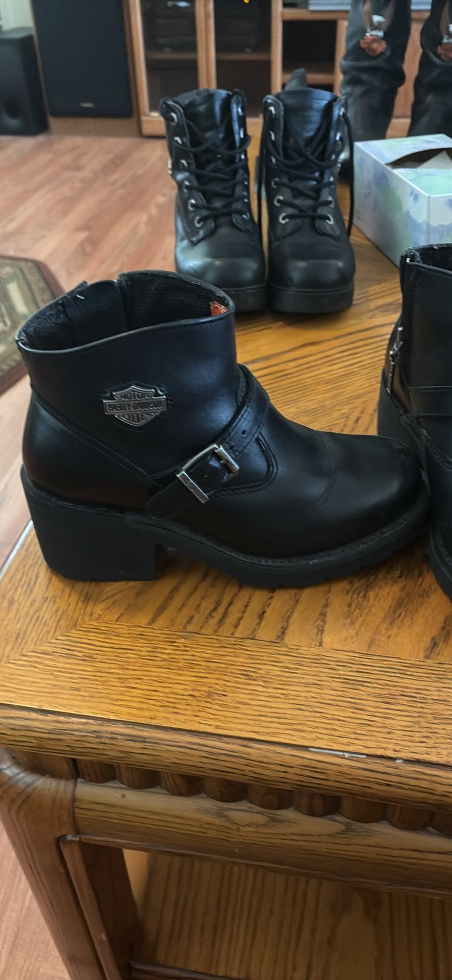 Gently used in great condition black leather Harley Davidson boots with buckle and zip up for easy wear! asking 100 obo