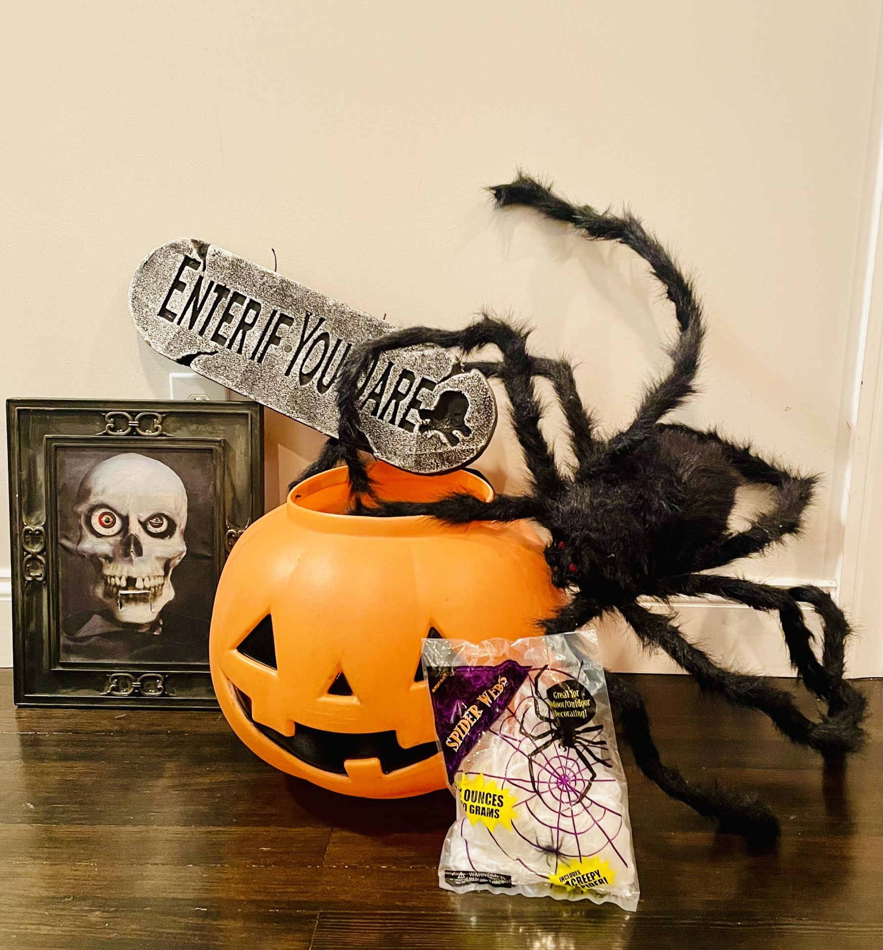 Halloween Decorations Bundle Just in time for the big day. A Spooktacular bundle to greet your visitors. Plastic Pumpkin Bowl (12”x17”) Spider - fabric and foam (3 feet diagonally!) “Enter if you dare” sign Cobwebs Skull box (AS-IS) - mouth moves, but needs repair to the battery harness