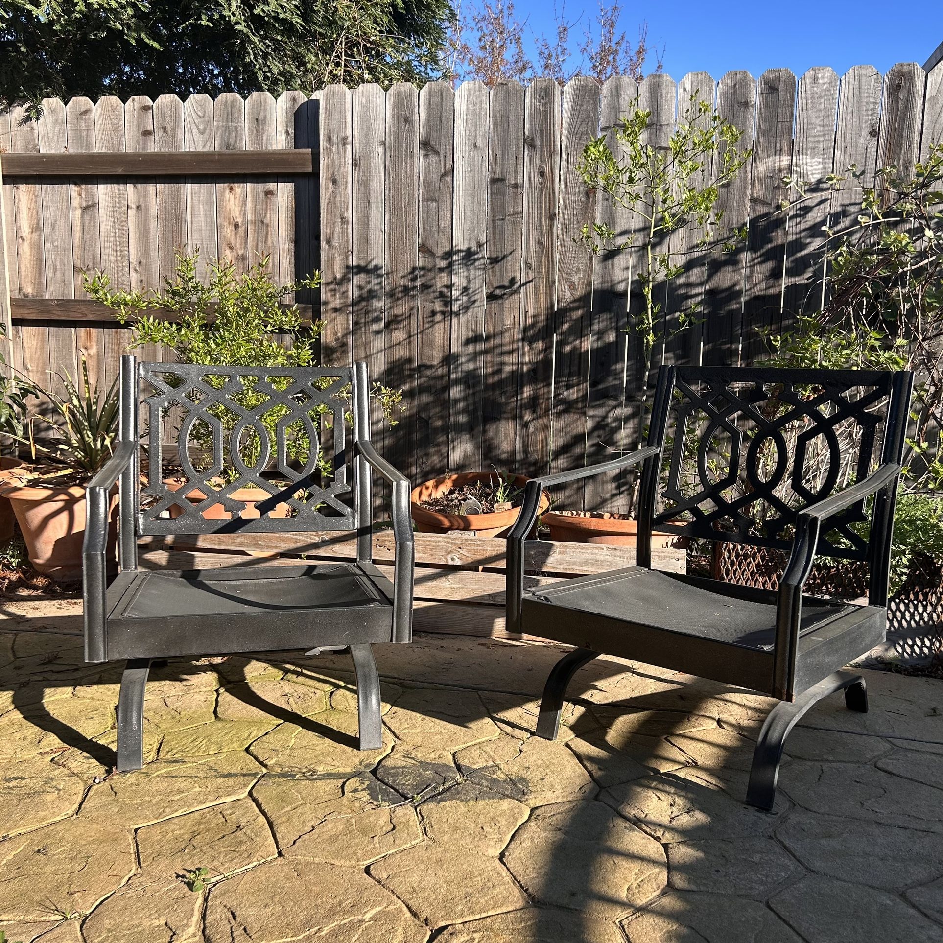 This pair of black metal patio chairs are very solid and sturdy. Dimensions: W 25 1/2” x D 25” x chair back H 33 1/2” (seat H 13”). Heavy and well-made chairs that both rock smoothly. Some light paint chipping on couple of spots (new coat of spray paint would make them shine). From a pet and smoke free home. Pick up in Elk Grove, 95757.