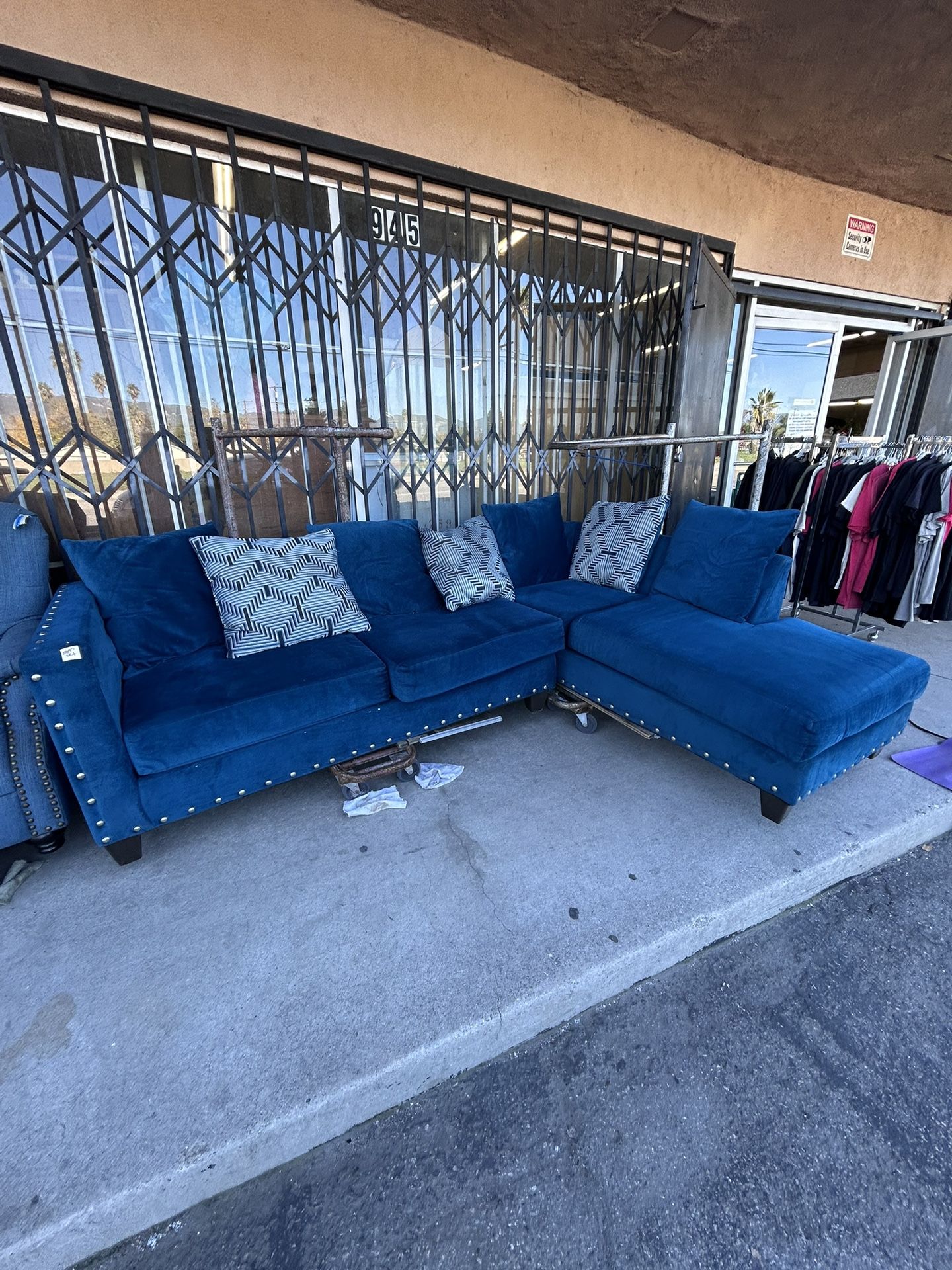 Selling this like-new, super soft royal blue velvet sectional with a comfy chaise lounge—it's a striking piece and includes 7 throw pillows! 🛋️🪶 LIMITED TIME SALE ‼️ 📏 Dimensions: approx. 9 ft (W) x 78 in. (D) x 30 in. (H) ✅ Preowned, in Great condition. The sofa is missing one nailhead on its trim. Please let us know if you have any questions! NOTE: Delivery for a fee, Pickup at Gina’s Bargain Thrift in San Bernardino! Pay with Cash, Debit, or Credit in person. Thank you! Open Monday-Saturday, 9AM-5PM! 945 E Base Line St, San Bernardino, CA 92410