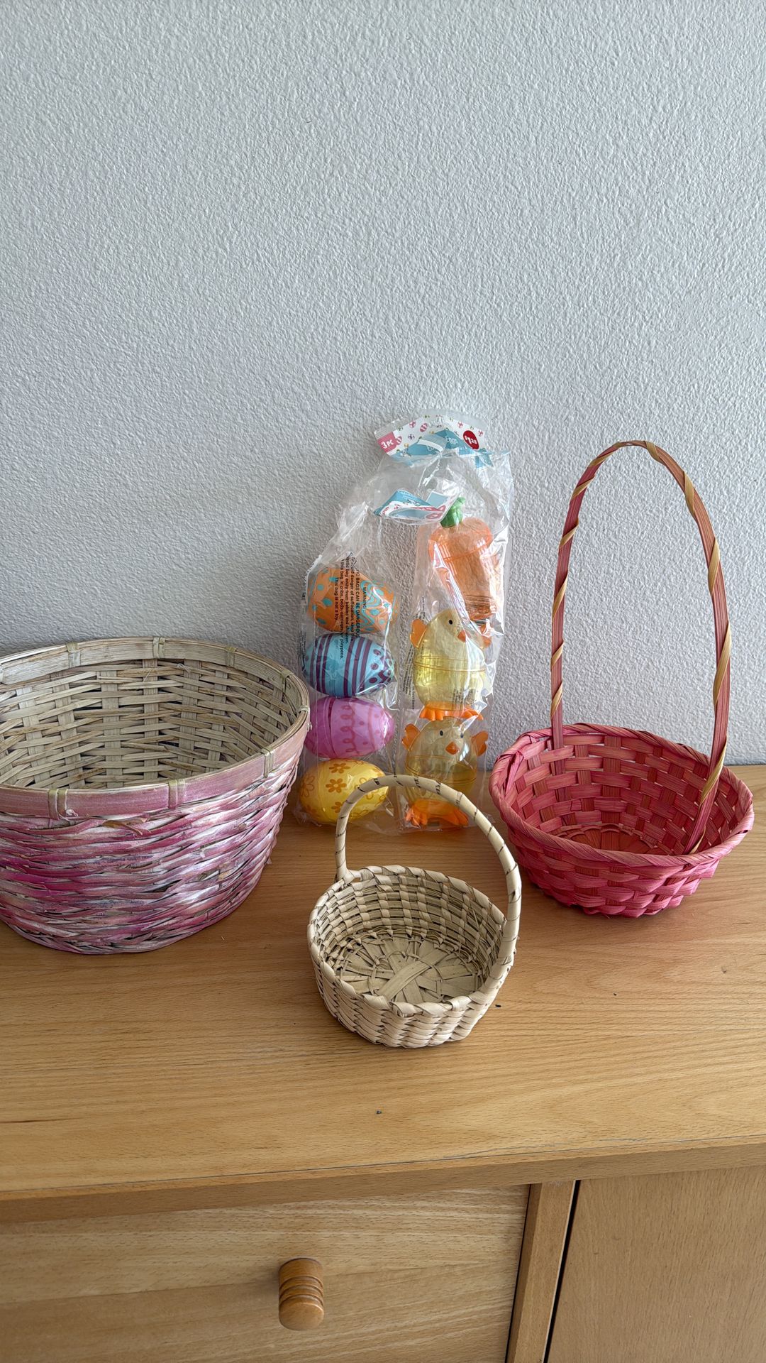 3 baskets 4 xl eggs 2 plastic stufable chicken + carrot