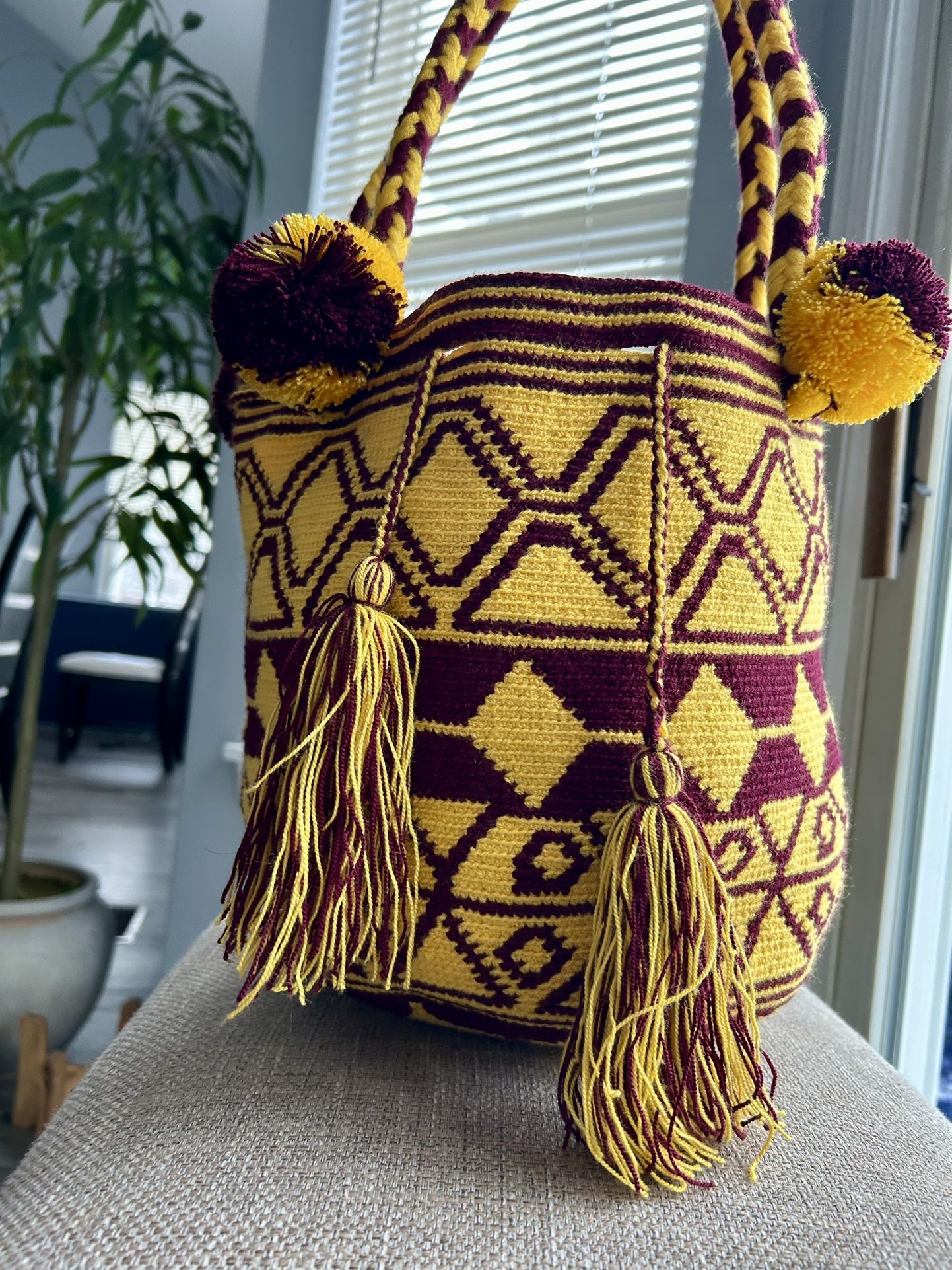 THE ORIGINAL MOCHILA WAYUU IS ART OF CULTURAL AND CREATIVITY ROOTED IN THE WAYUU HISTORY AND EXPERIENCE. THIS CULTURAL HERITAGE IS THE KEY ECONOMIC AND PRODUCTIVE RESOURCE THAT WAYUU WOMEN HAVE TO SUSTAIN THEIR FAMILIES AND COMMUNITIES. EMPOWERING THESE WOMEN WITH DIRECT TRADE, EACH PURCHASE OF MOCHILA WAYUU CONTRIBUTES TO THE CONSERVATION OF THE ANCESTRAL TRADITIONS AND INCOME GENERATION FOR THISMATRIARCHAL SOCIETY. YOUR PURCHASE CONTRIBUTES INDIRECTLY TO THE ENVIRONMENTAL PRESERVATION OF THE GUAJIRA PENINSULA. COLORS: As pictured APPROXIMATE DIMENSIONS: HEIGHT : 11 -11.5" inches DIAMETER: 10" - 5.5" inches STRAP DROP: 44" inches This is a large size bag. shoulder bucket bag crossbody or shoulder Drawstring closure 100% Authentic, made by indigenous Wayuu 2 stitch wave (two thread) bohemian boho style shoulder / Crossbody bag. Just perfect for any season, Coachella or festival Be proud of the one of a kind piece that you purchasing. Fast shipping from US International Buyers – Please Note: Import duties, taxes, and charges are not included in the item price or shipping cost. These charges are the buyer's responsibility. Please check with your country's customs office to determine what these additional costs will be prior to bidding or buying