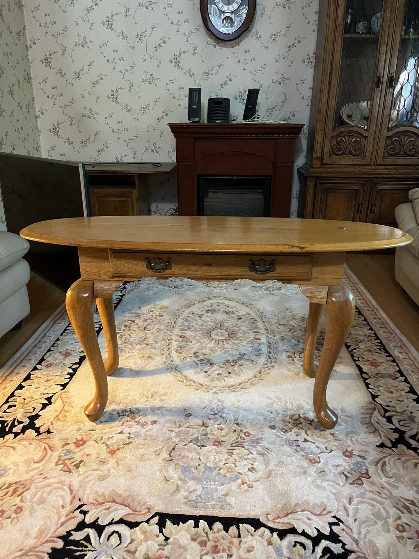 Vintage Broyhill country side table with drawer, charming brass pulls, and elegant Queen Anne legs. Solid oak.