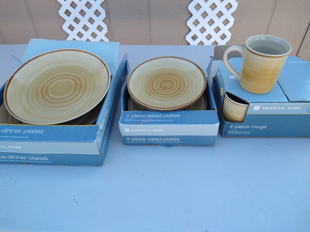 4 piece dinner plates, 4 piece salad plates and 4 piece mugs, New! Still in box, light brown color. $15 for Everything! Dishwasher, microwave & Oven safe