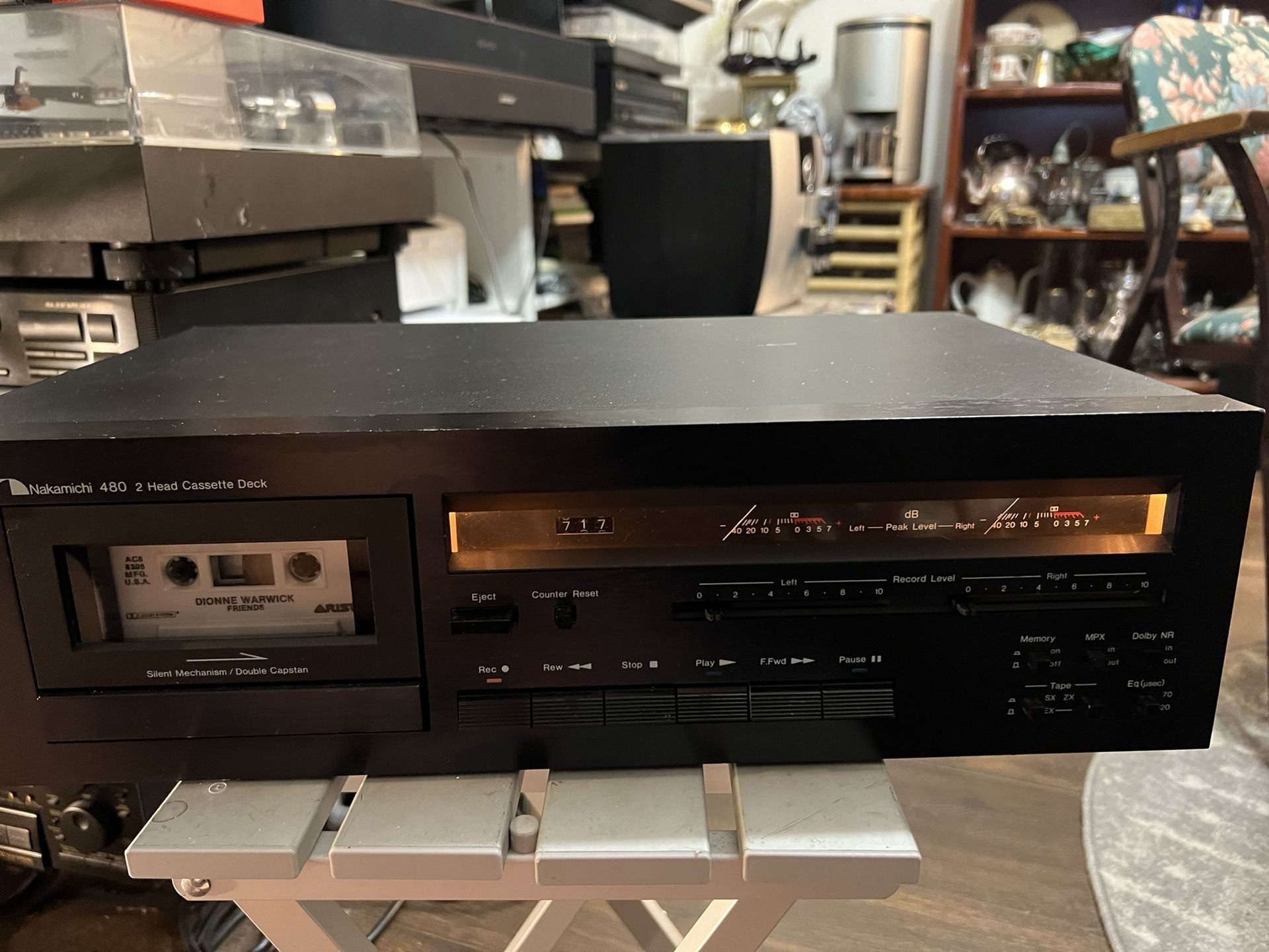Nakamichi 480 2 Head Black Cassette Deck. Tested. Very cleaned. Works great. Description: Manufacturer: Nakamichi Model: 480 Type: Cassette Tape Deck Years of manufacture: 1(contact info removed) Made in: Japan Colors: Black, Silver Remote control: Cable remote control optional Power consumption: maximum 23 W Dimensions: 450 x 135 x 289 mm (WxHxD) Weight: 7.2 kg Original price approx.: 998 DM Connections Number of inputs: Line 50 mV/30 KOhm Number of outputs: Line 0.6 V/2.2 KOhm Headphone Technical Data Sound heads: 2 Motors: 3 Synchronisation fluctuations: < 0,05% WRMS Band types: Type I, II, IV Frequency response: 20 - 20.000 Hz Distortion factor: < 1% Signalrauschabstand: >62 dB with Dolby B Auto-Reverse: No Title search: No Dolby: B MPX Filter: Switchable Fader: No Pitch control: No CD synchro recording: No